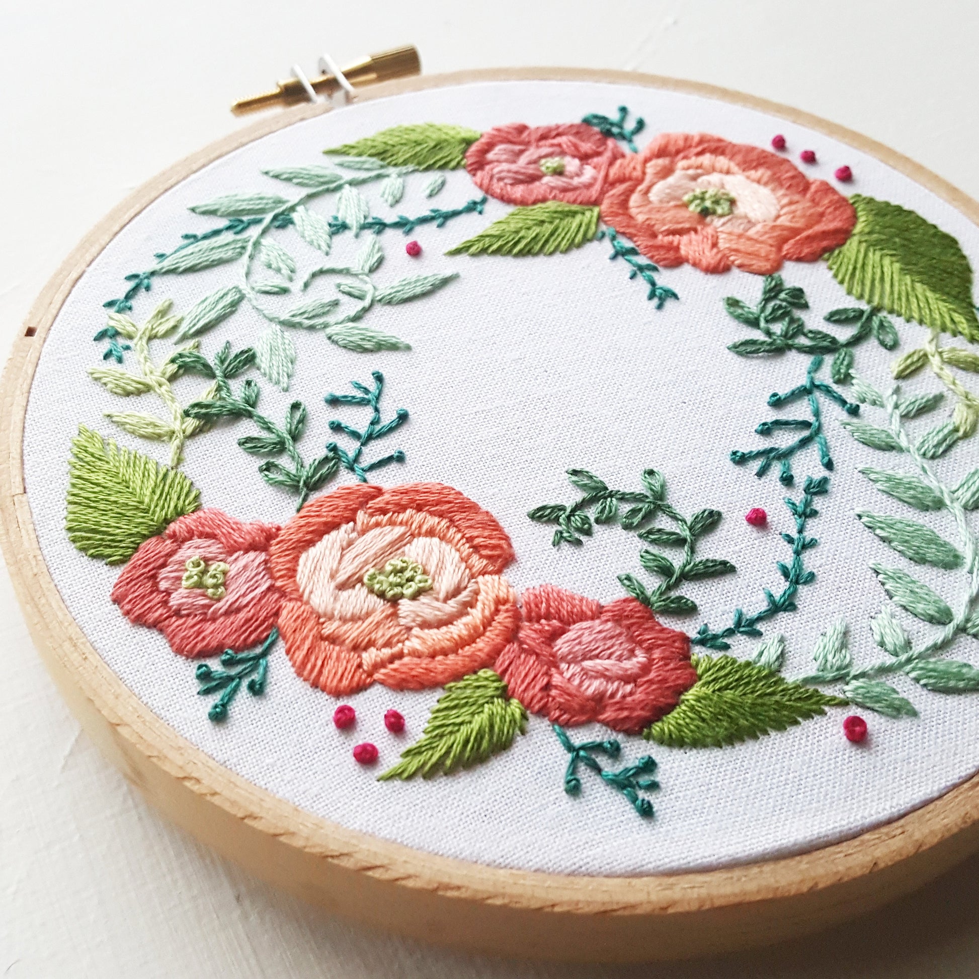 This is a fun, versatile pattern. It features seven different stitches to practice and the color combos are absolutely endless. You can dress it up (metallic floss, paint/stain your hoop, variegated floss, crazy patterned fabric, etc) or stitch it exactly as written and get a beautiful piece of art for your walls! The pattern includes a color guide to recreate the pictured hoop (peach and pink roses on white fabric.)