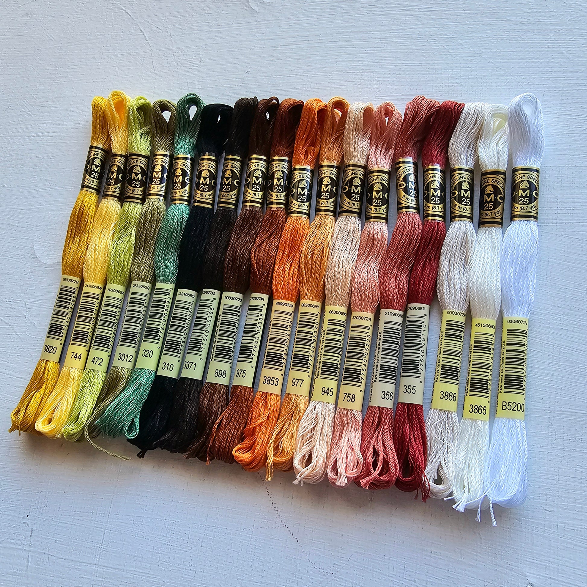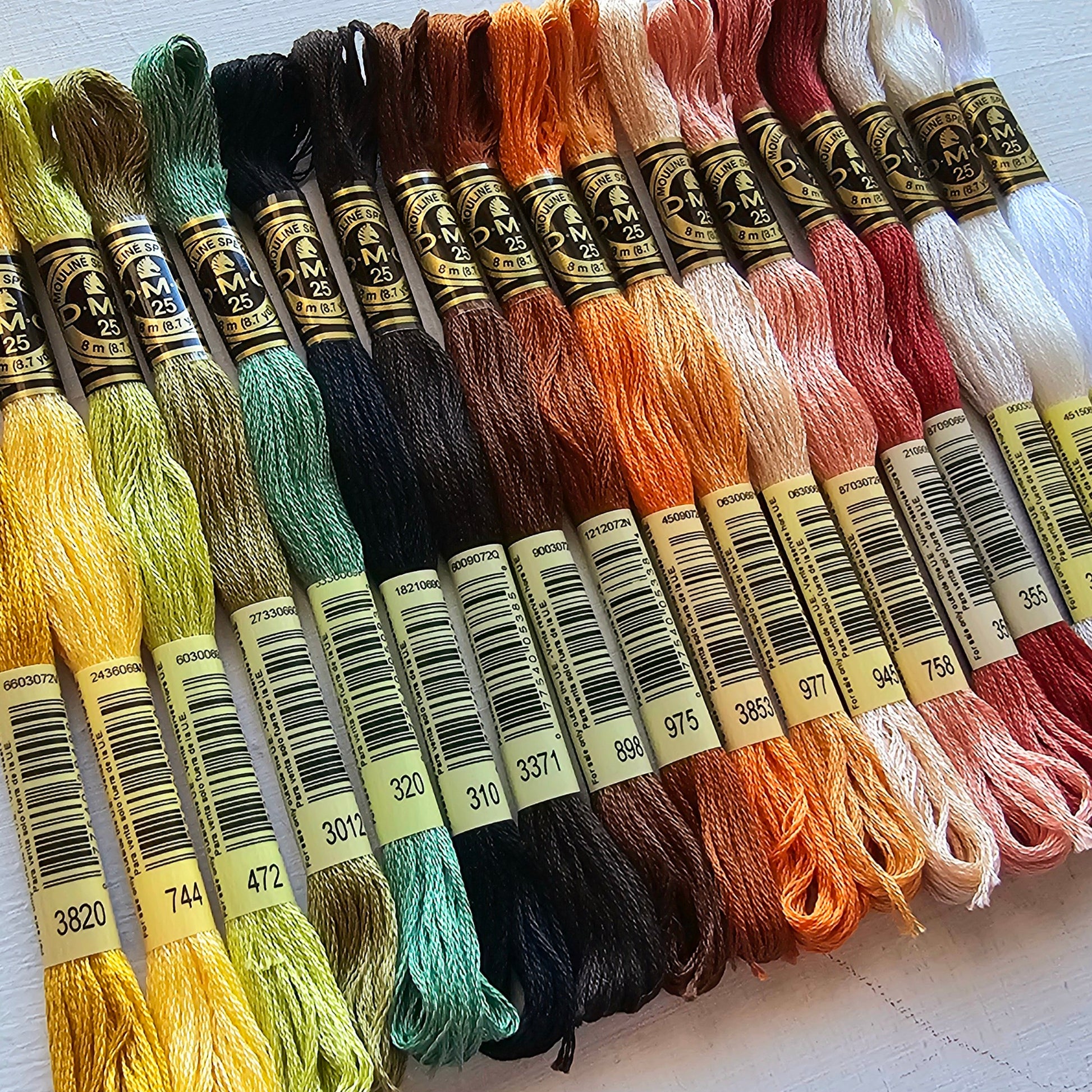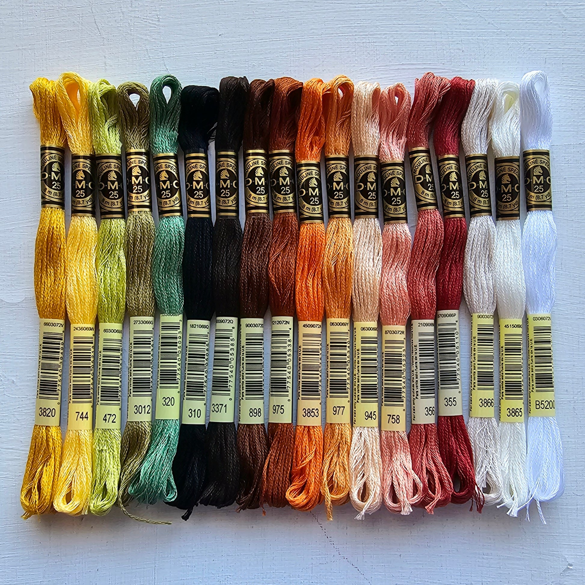 18 full skeins of DMC embroidery floss for completion of the Autumn Wreath embroidery pattern. Fabric, hoop, needles, etc are NOT INCLUDED.