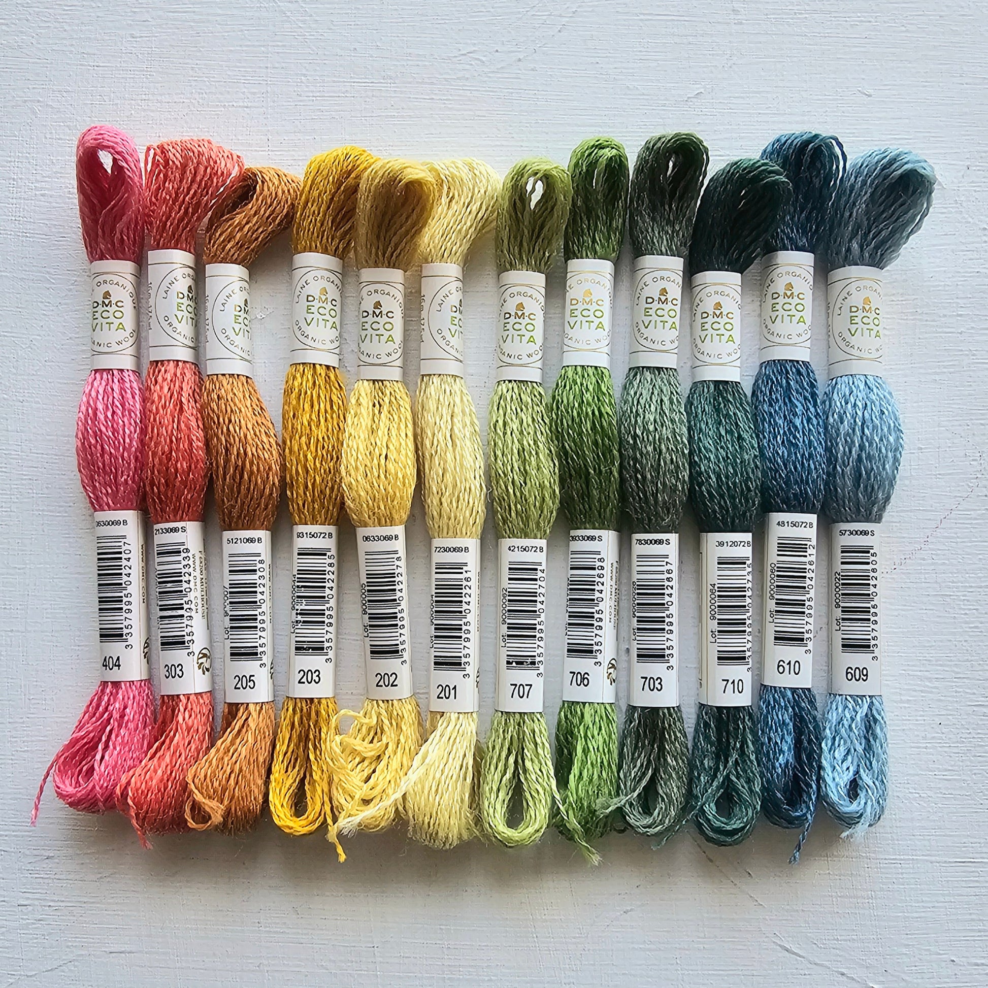 12 beautiful skeins of DMC Eco Vita wool thread. This "soft rainbow" bundle includes a lovely array of naturally dyed organic wool.