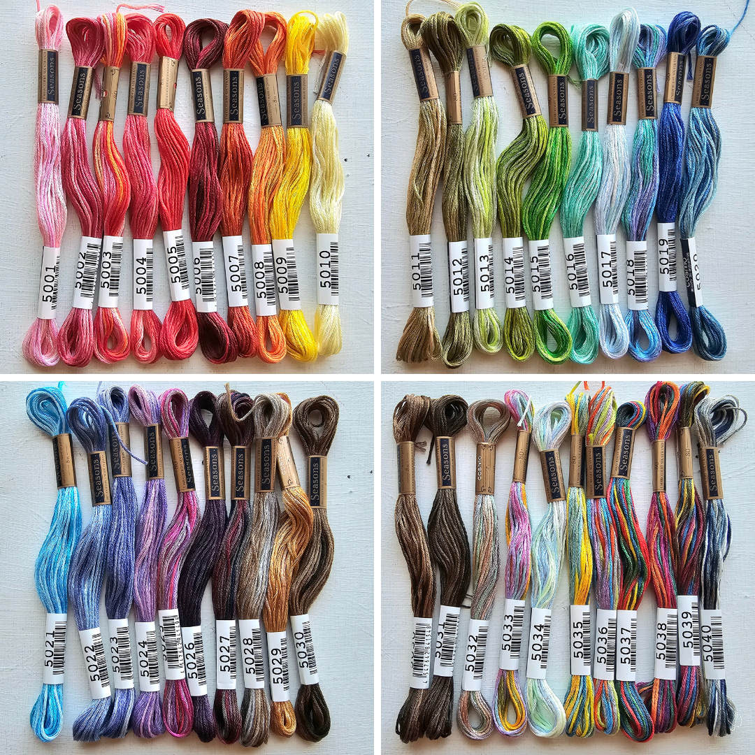 Full skeins of Cosmo's Seasons variegated cotton six strand hand embroidery thread. Each bundle includes 10 skeins.
