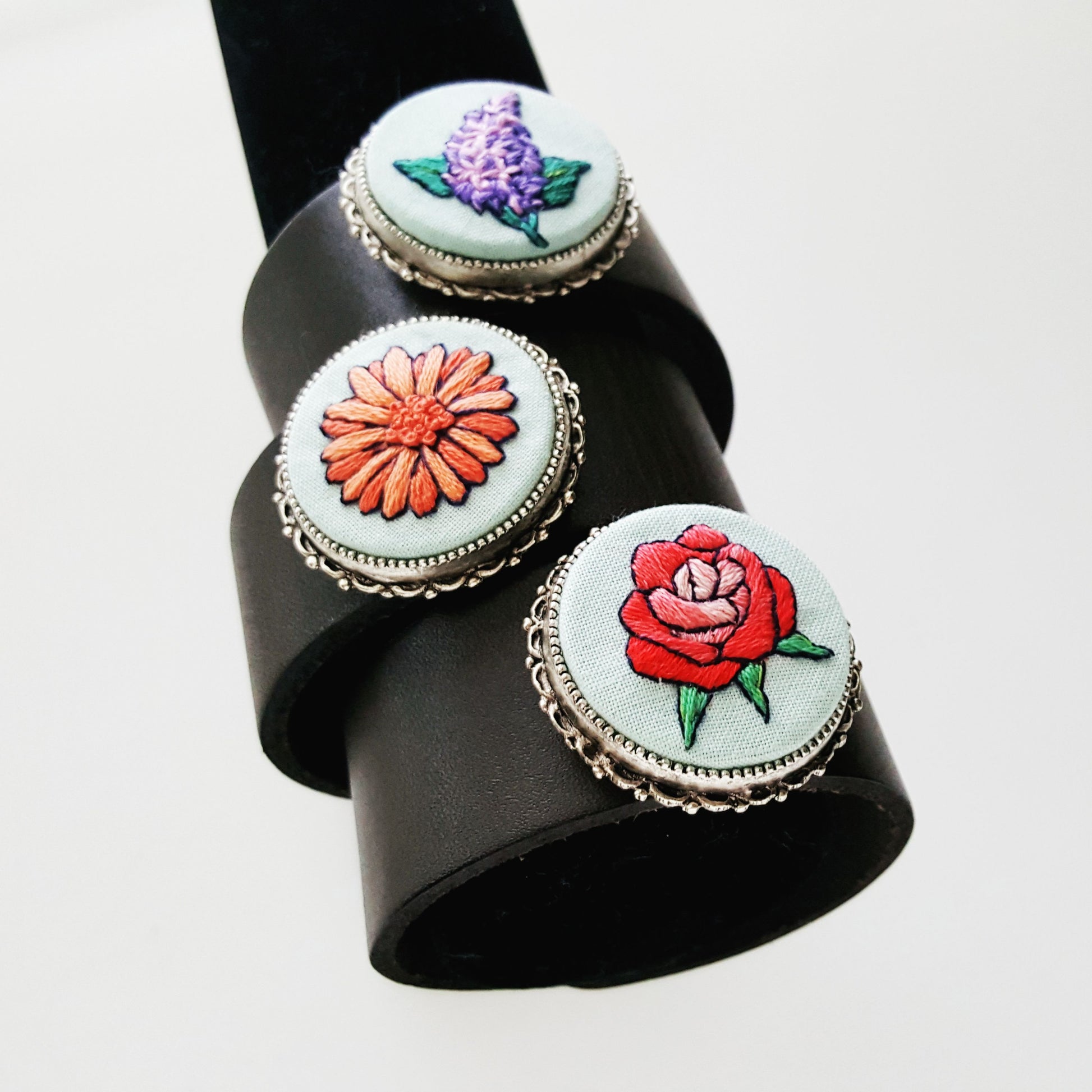 This PDF includes five mini embroidery patterns featuring a rose, tulips, lilac, gerbera daisy and star jasmine. These patterns are sized to fit these circular jewelry bezels, but can be resized and reused for other projects. A stitch guide and color suggestions are included in the 3 page document.