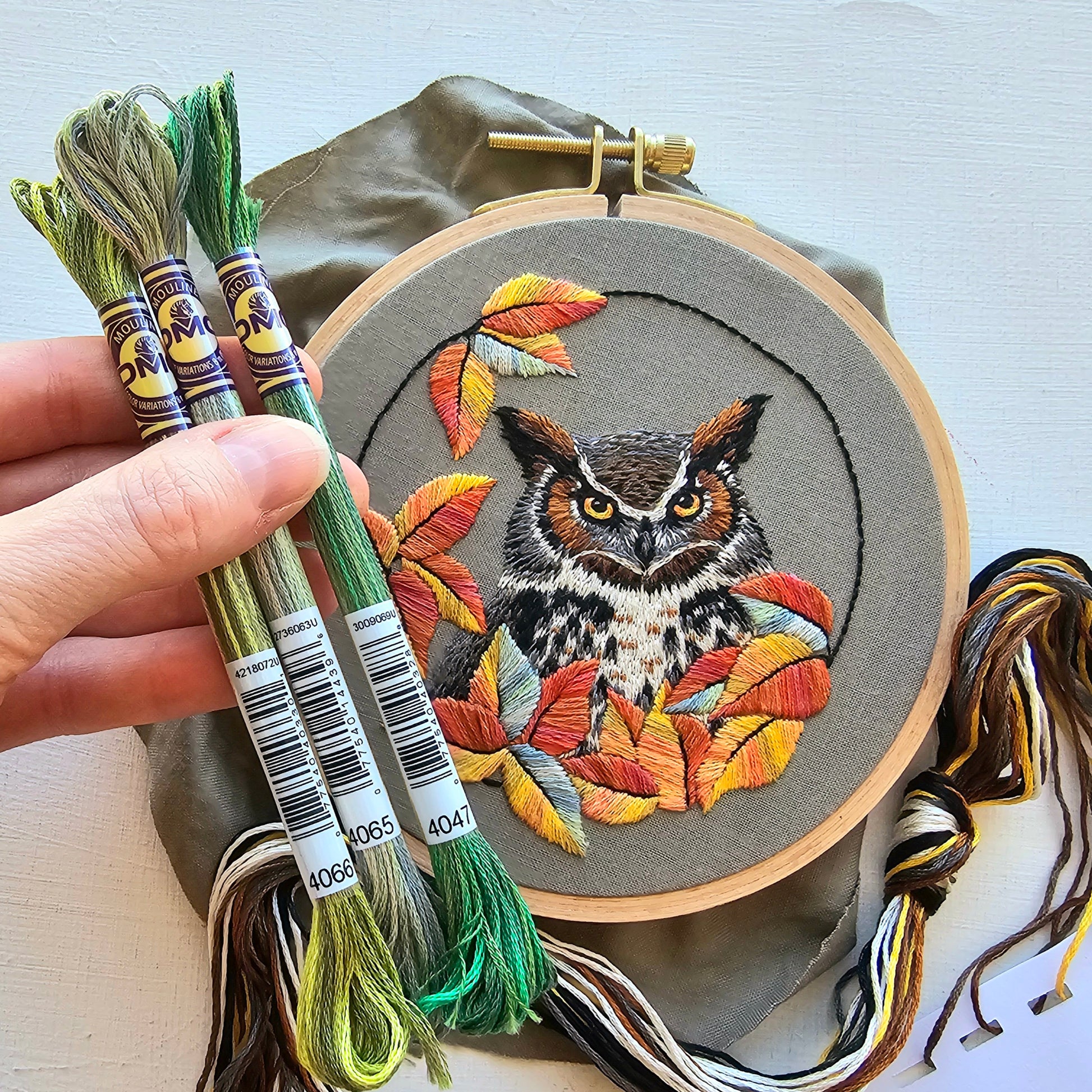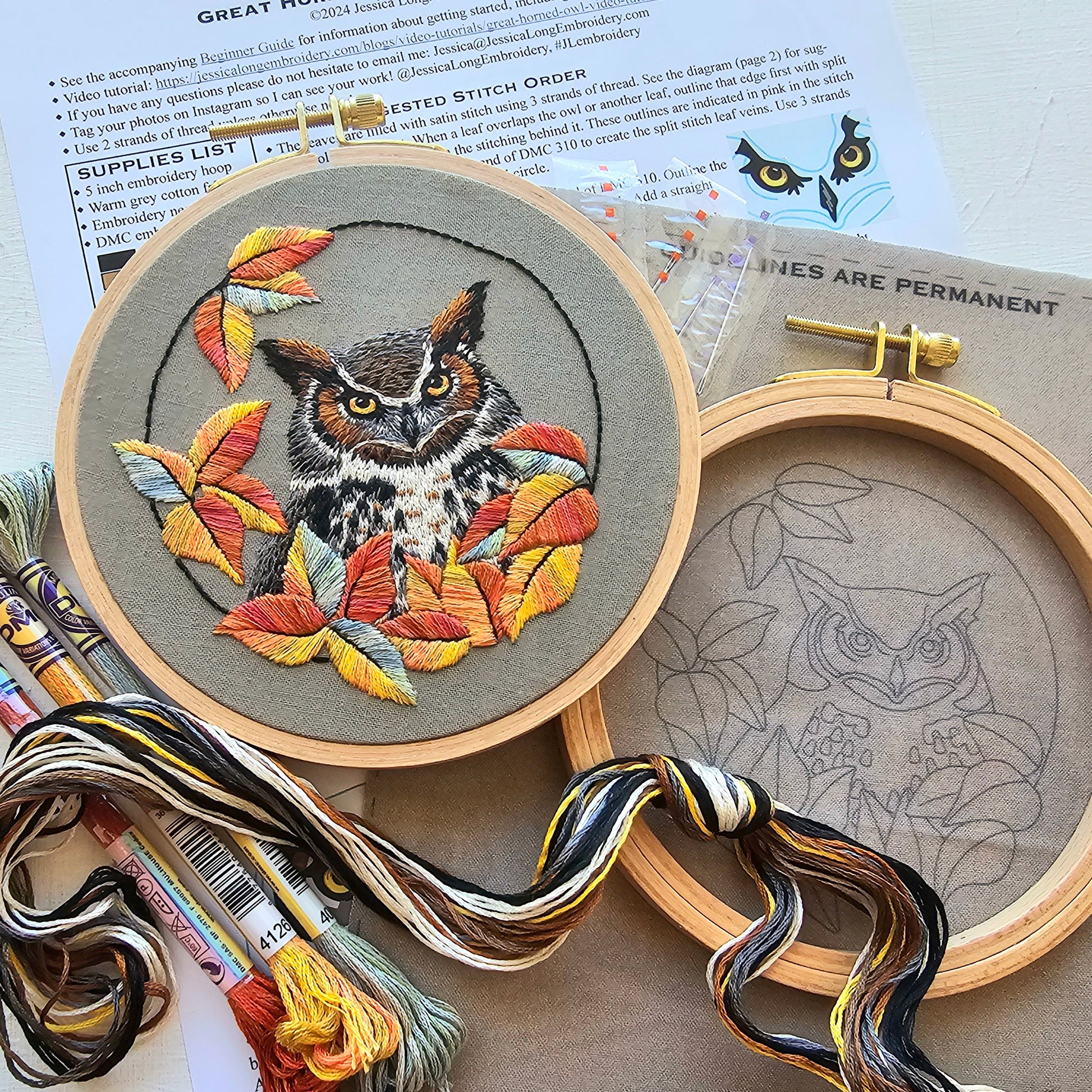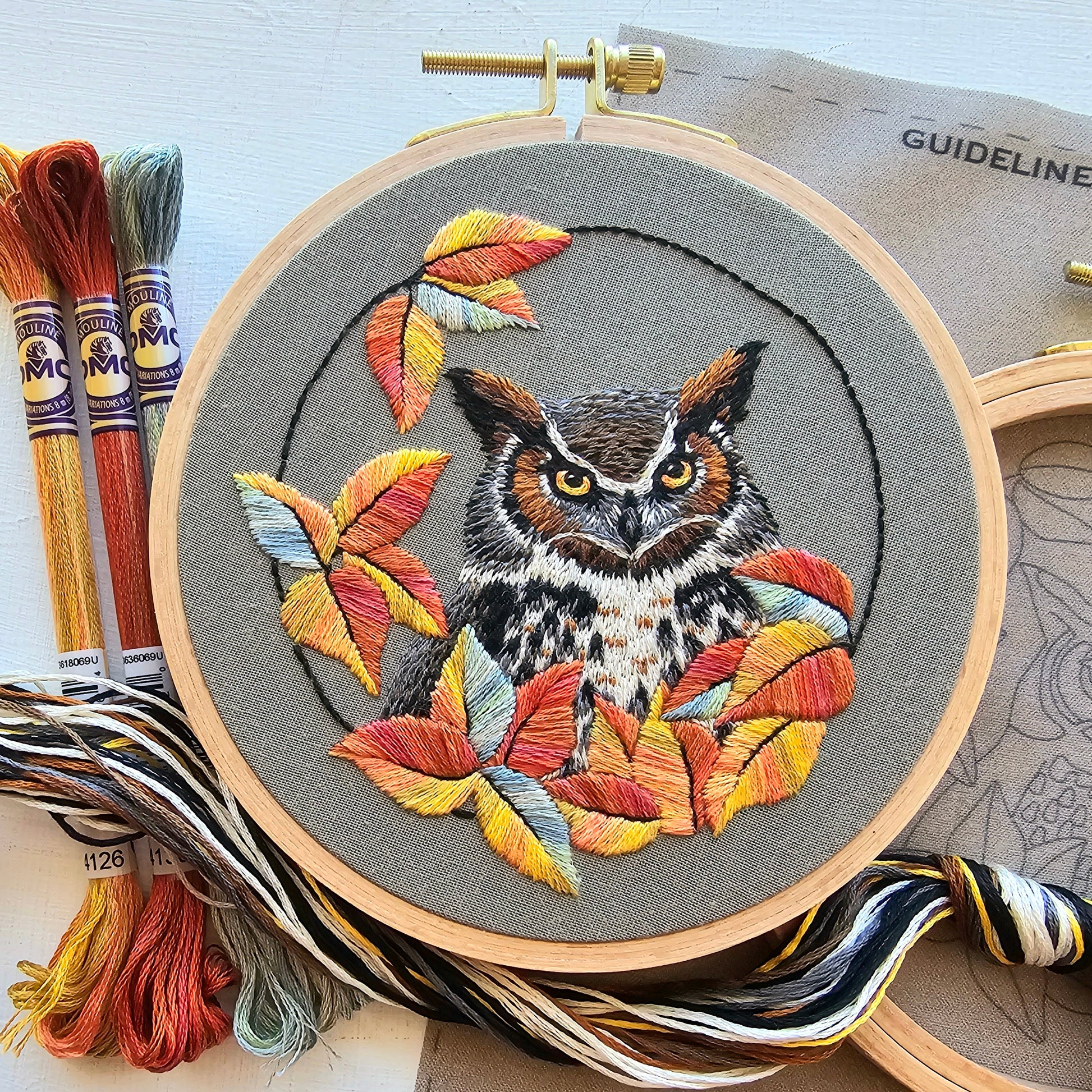 This eye-catching autumnal project combines realistic thread painting with bright, bold satin stitched leaves. Recreate the intricately spotted and striped feathers of the great horned owl using a full palette of colors while following along with an online video tutorial. The kit includes everything you need to complete the project, from detailed instructions and diagrams to quality stitching supplies.