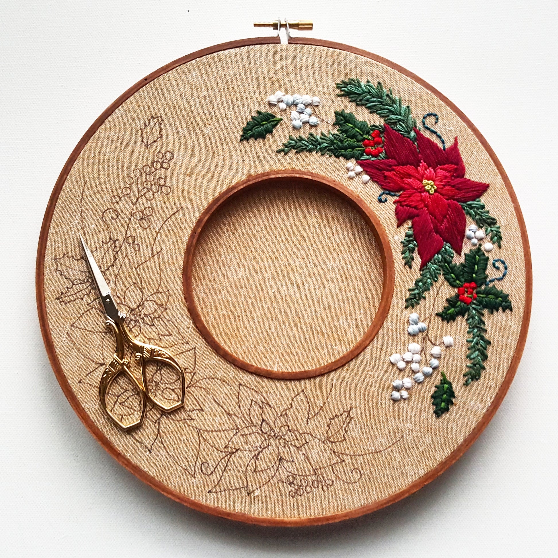 Stitch your own gorgeous holiday wreath with this unique double hoop embroidery kit! Hang it on your wall during the holiday season or stitch it up as a thoughtful heirloom gift for a friend. Deck your halls with embroidery! Recreate the pictured double hoop style wreath or choose to frame in a standard single embroidery hoop. Be sure to read the details about each option below.