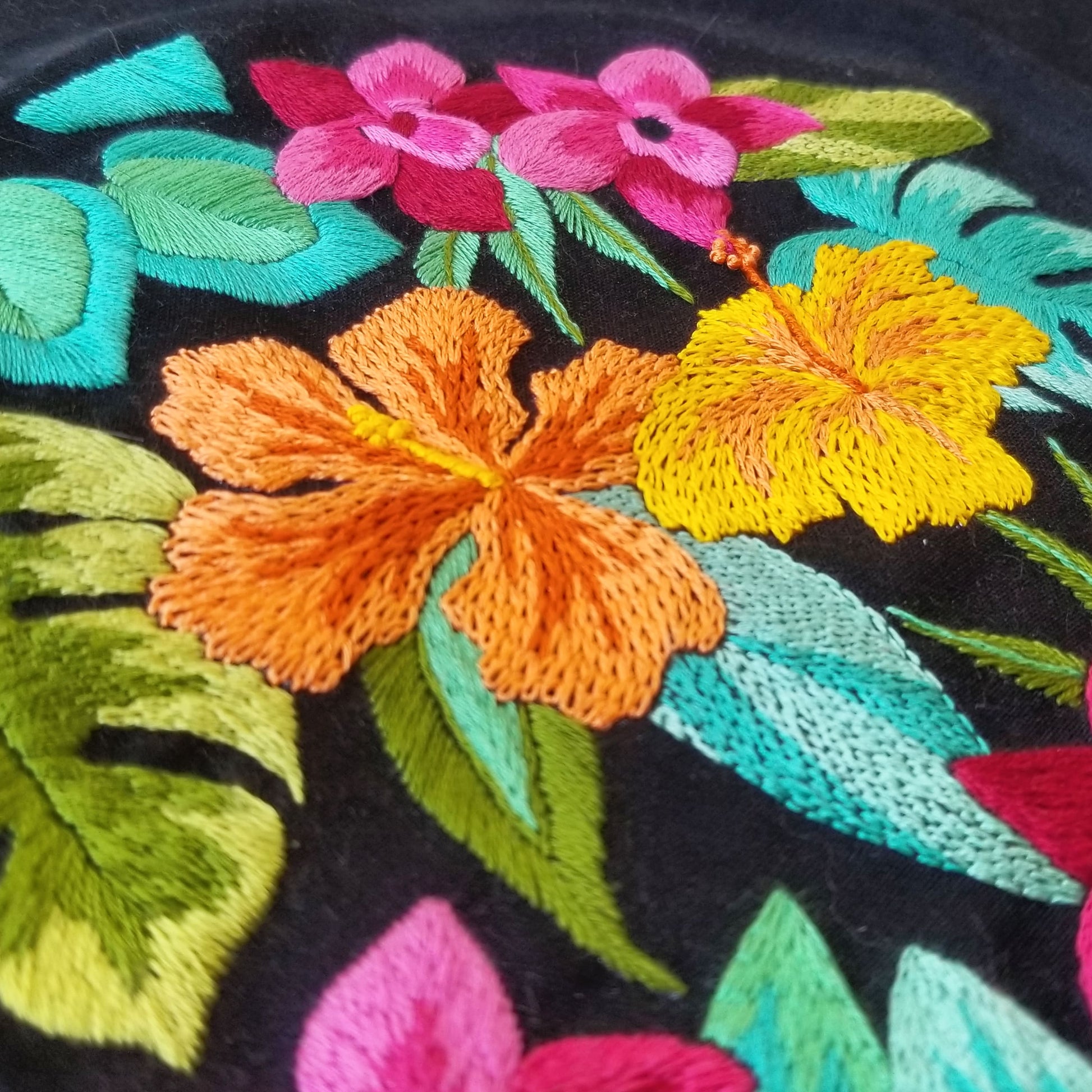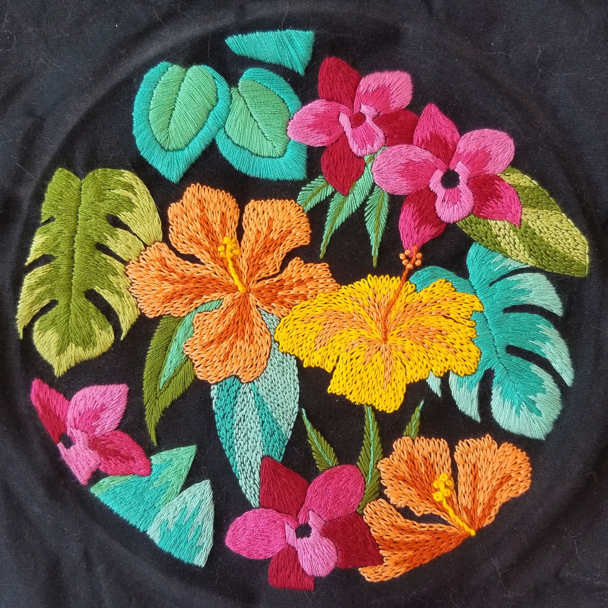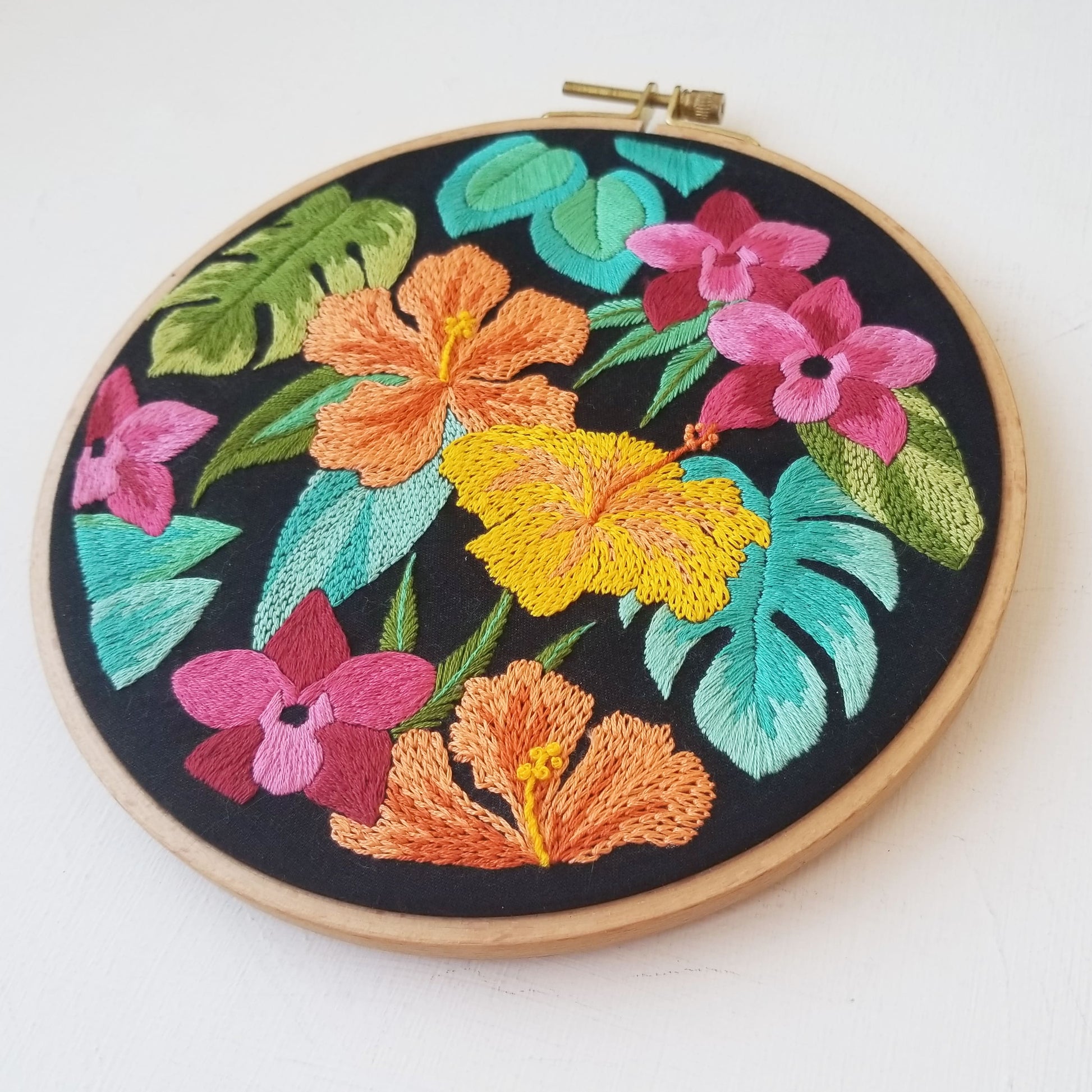 This lush, tropical design is fun to stitch and the result is an eye-catching piece of embroidery art. You'll be stitching hibiscus and orchids, plus a variety of rainforest plants. You can choose to fill the orchids with thread painting or keep it simple by filling in each petal with a solid color using split stitch. You'll also get to practice chain stitch, French knots, back stitch, satin stitch and more.