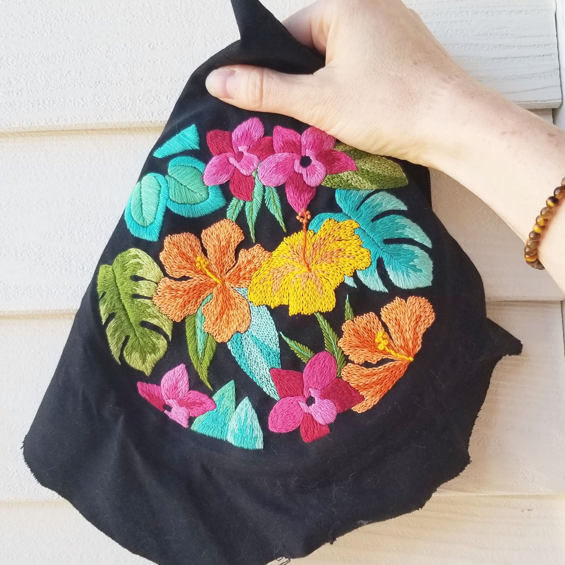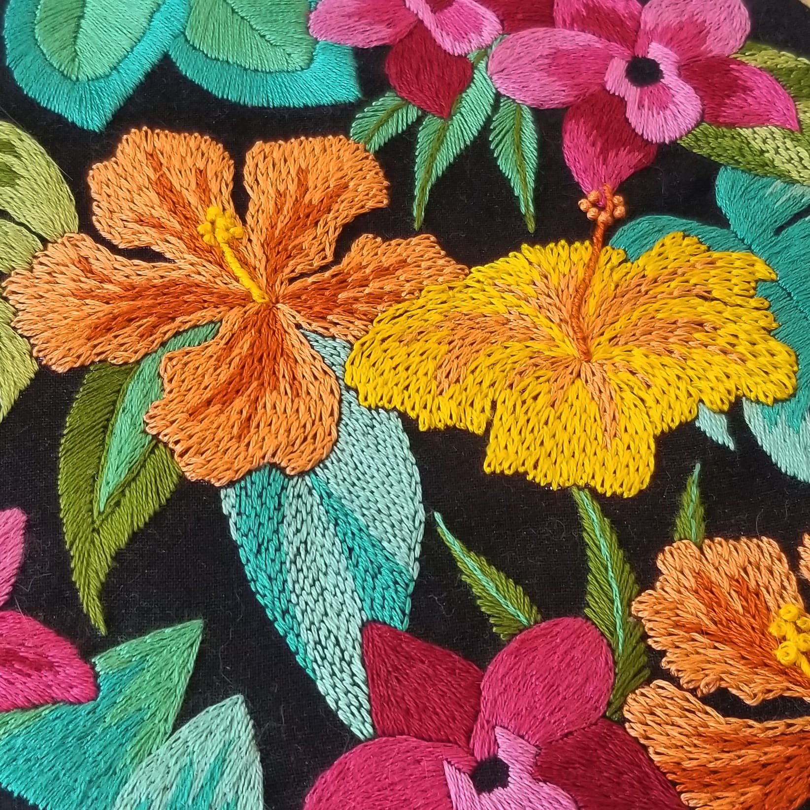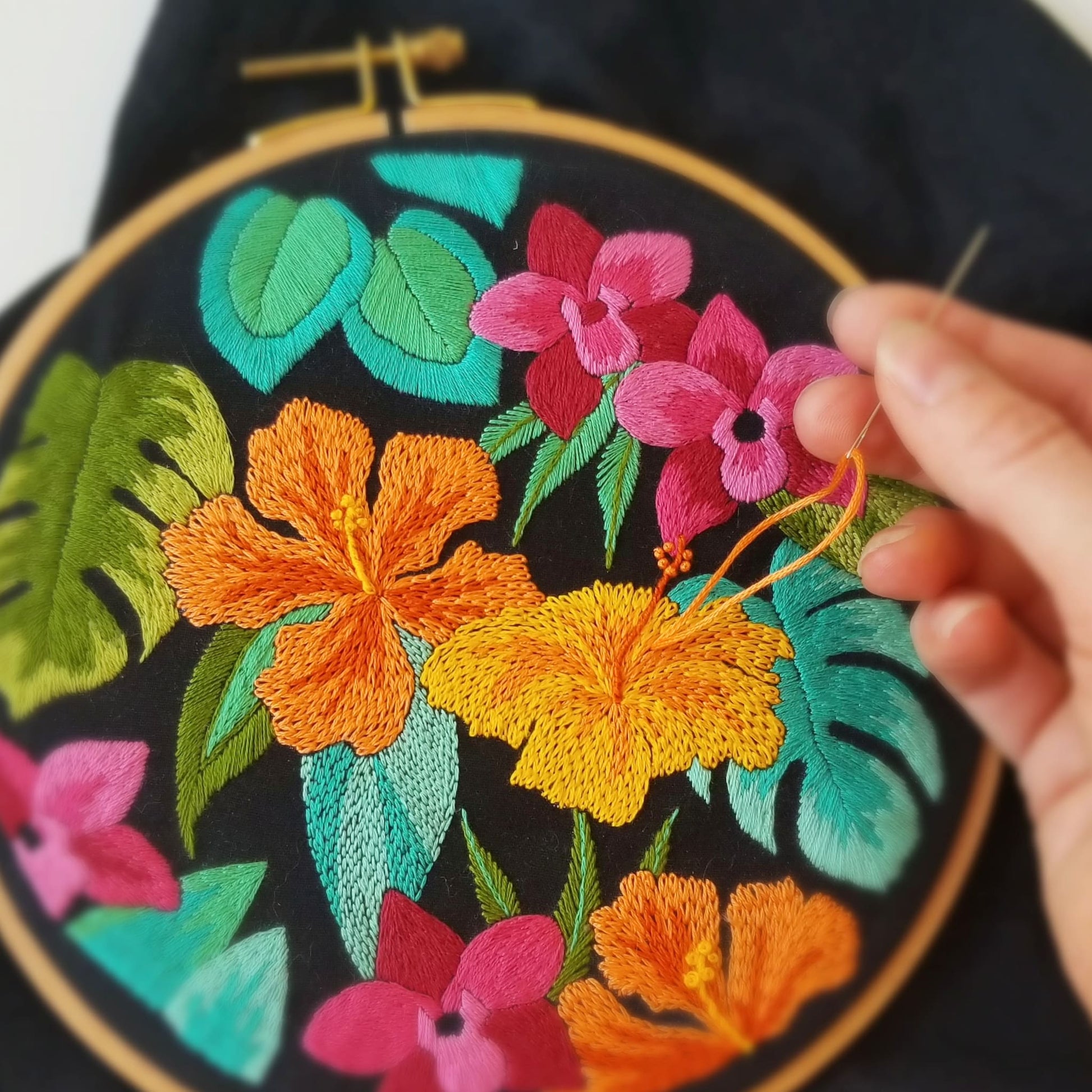 This lush, tropical design is fun to stitch and the result is an eye-catching piece of embroidery art. You'll be stitching hibiscus and orchids, plus a variety of rainforest plants. You can choose to fill the orchids with thread painting or keep it simple by filling in each petal with a solid color using split stitch. You'll also get to practice chain stitch, French knots, back stitch, satin stitch and more.