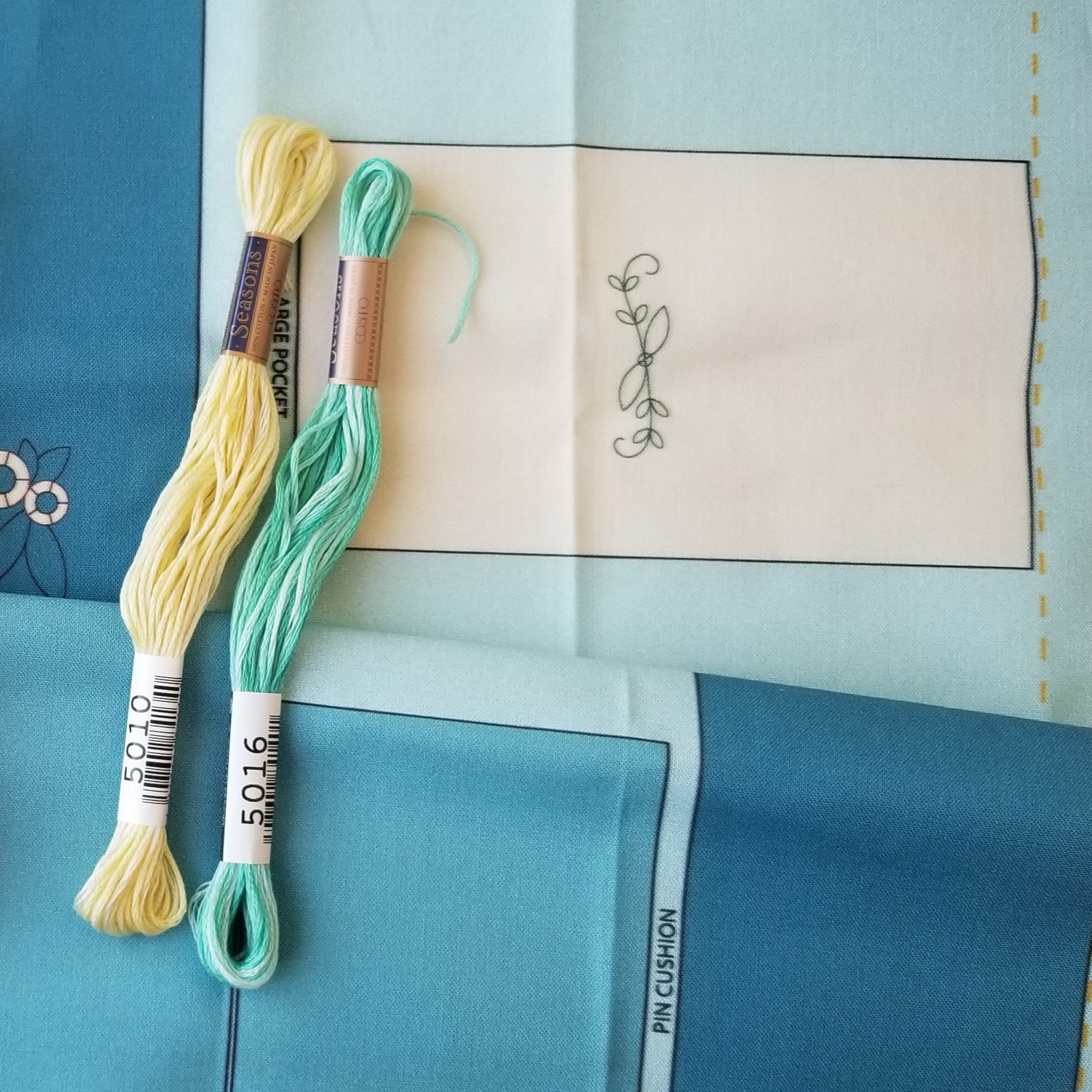 • 2 skeins of variegated embroidery floss from either DMC (for the turquoise fabric case) or Lecien Cosmo (for the taupe or blue fabric case). The new blue fabric case comes with a skein of 5010 (pale yellow) for the flowers and 5015 (light turquoise) for the greenery. If you'd like a different color swapped in (for example, the subtle orange DMC 4128 please leave a note at check out.