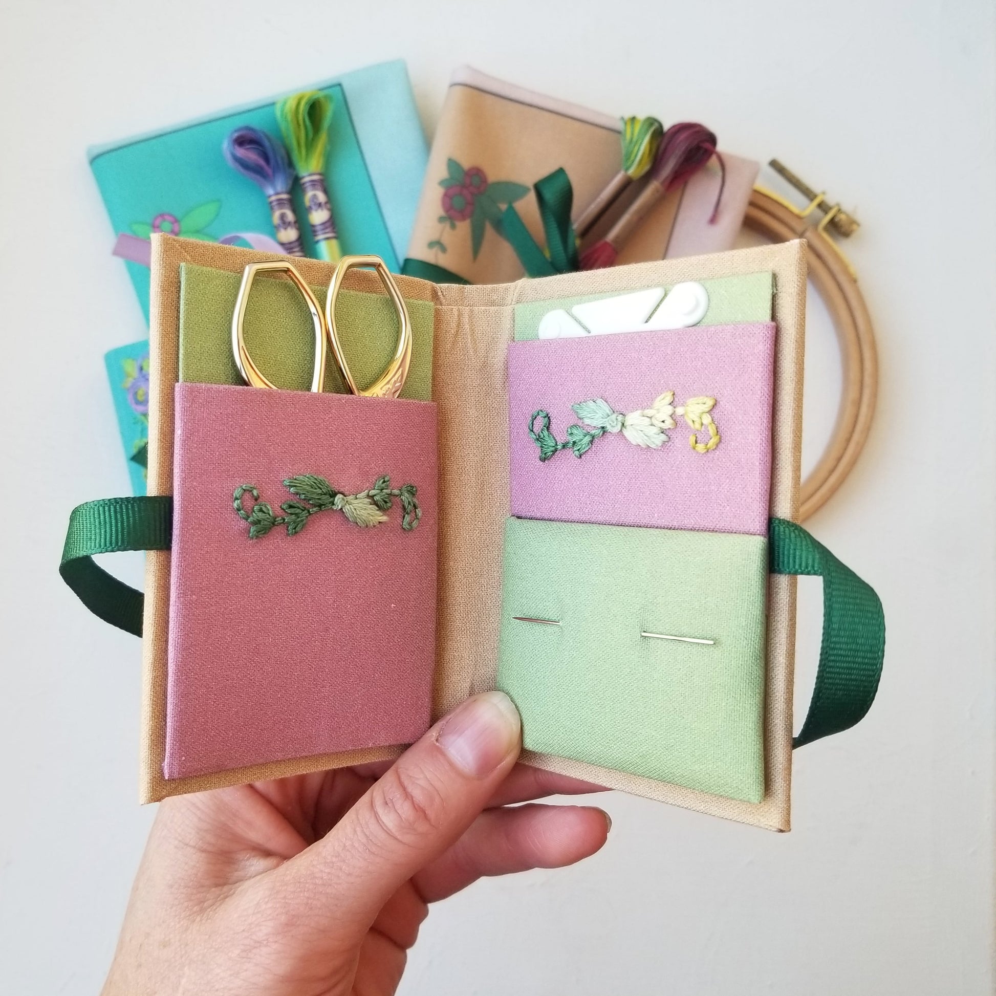 If you can do embroidery, you can make this mini sewing kit, too. The finished project is perfect for keeping a simple travel stash of stitchy goodies such as your embroidery scissors, favorite needles, and a bobbin or two of thread.
