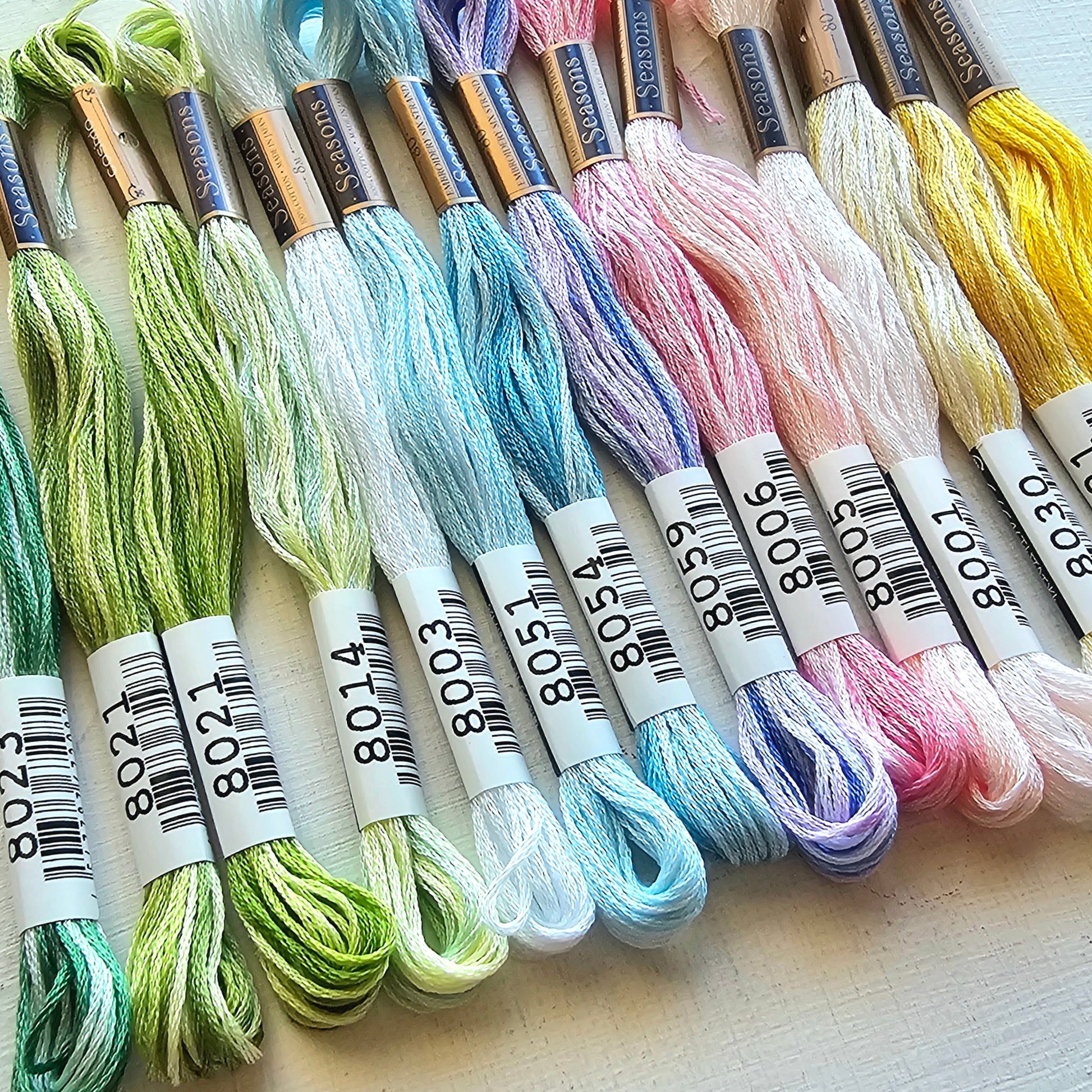 14 unique skeins of Cosmo's Seasons variegated cotton hand embroidery thread. Six-stranded.