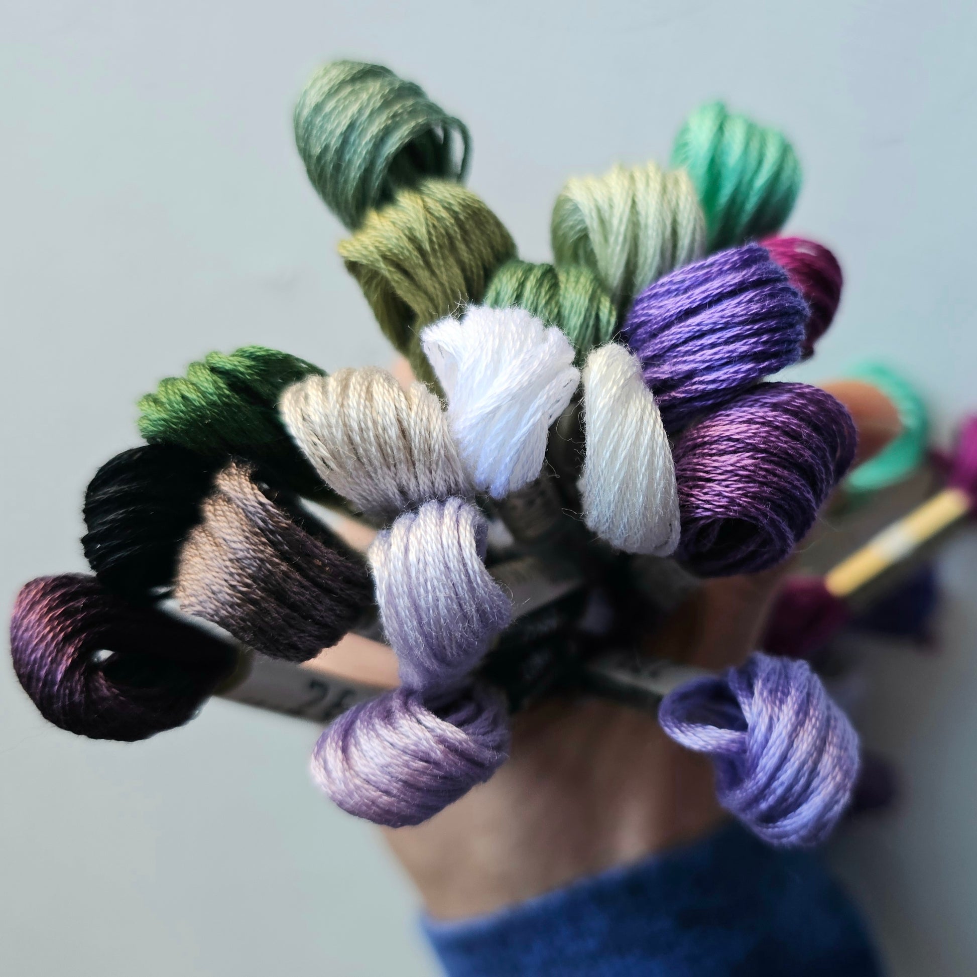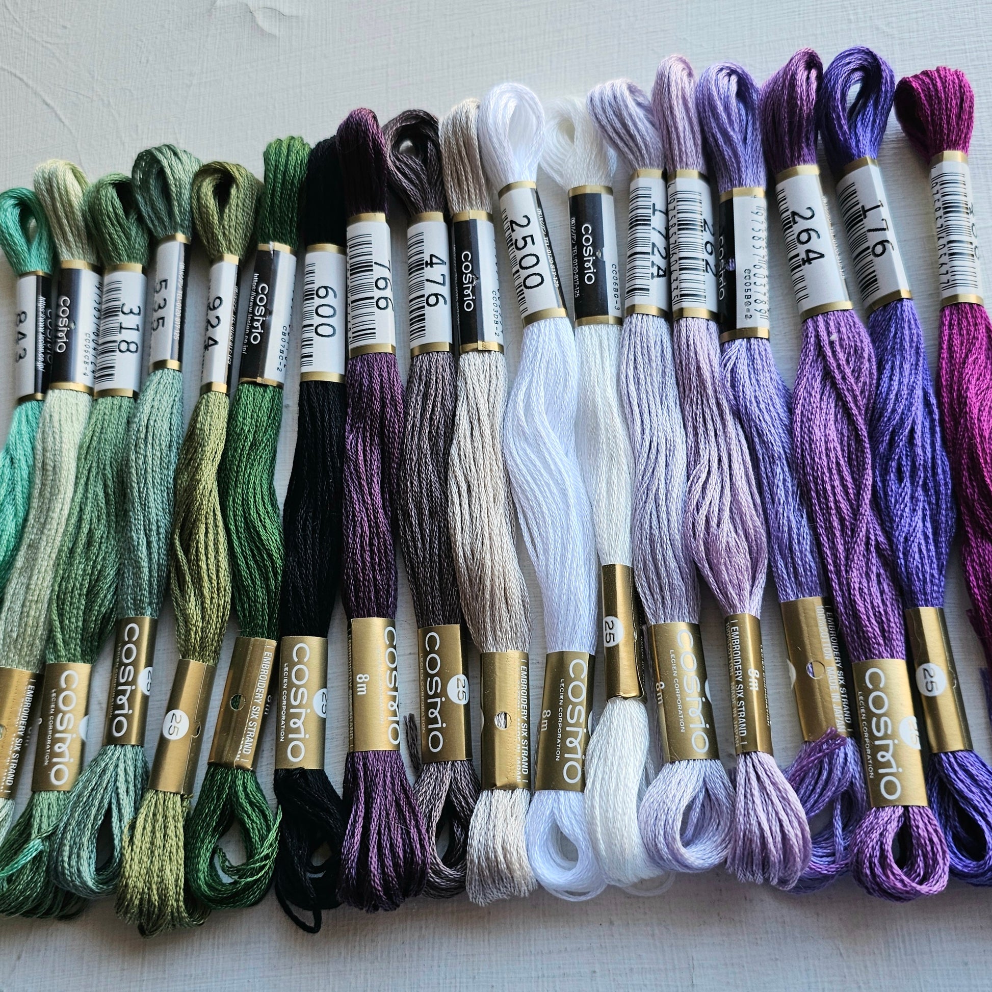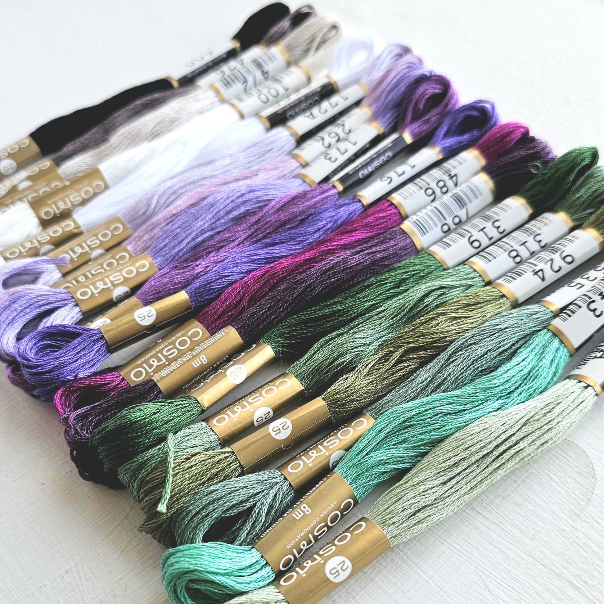 This bundle includes 18 colors of Cosmo embroidery floss. These lovely shades of purple and green are the same colors used in the Anemones and Succulents embroidery pattern, sold separately here: link