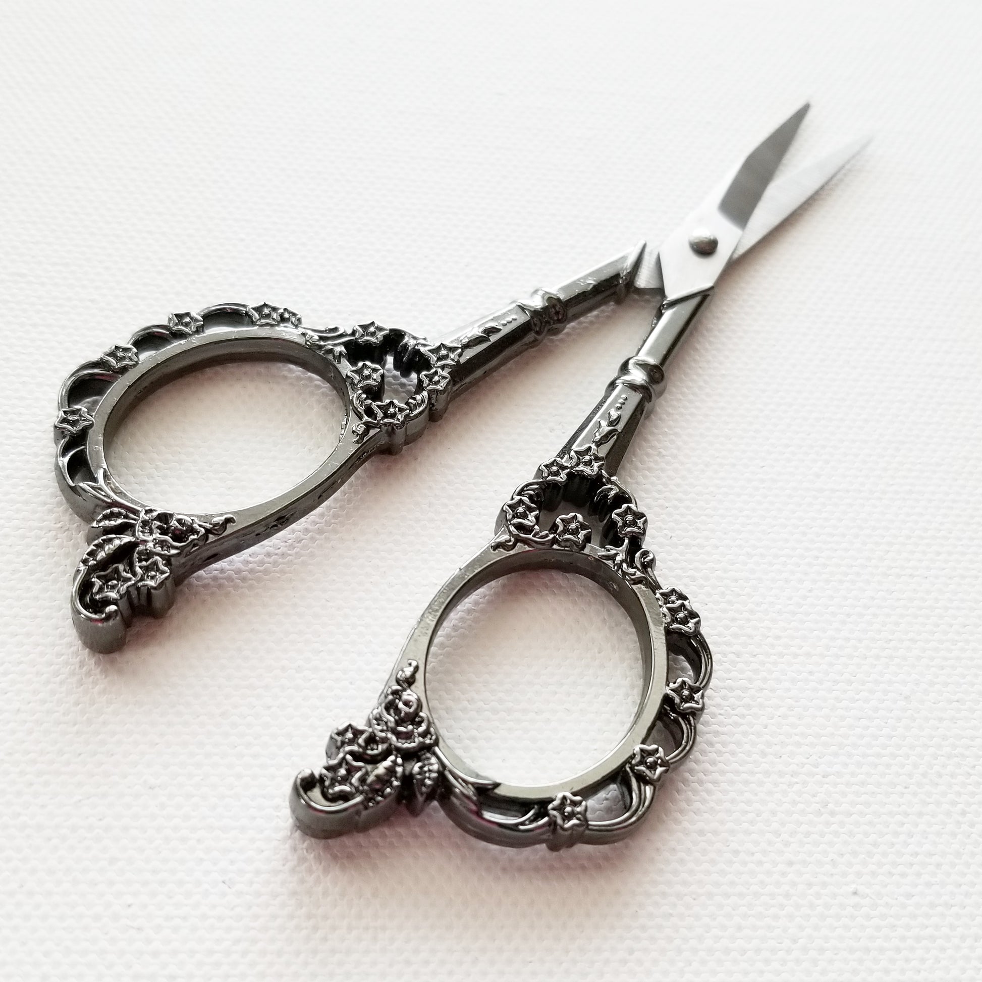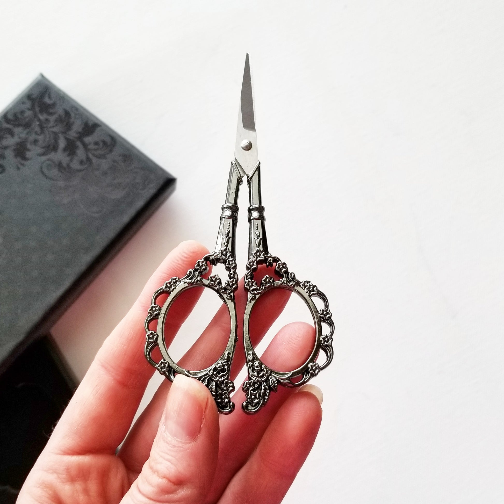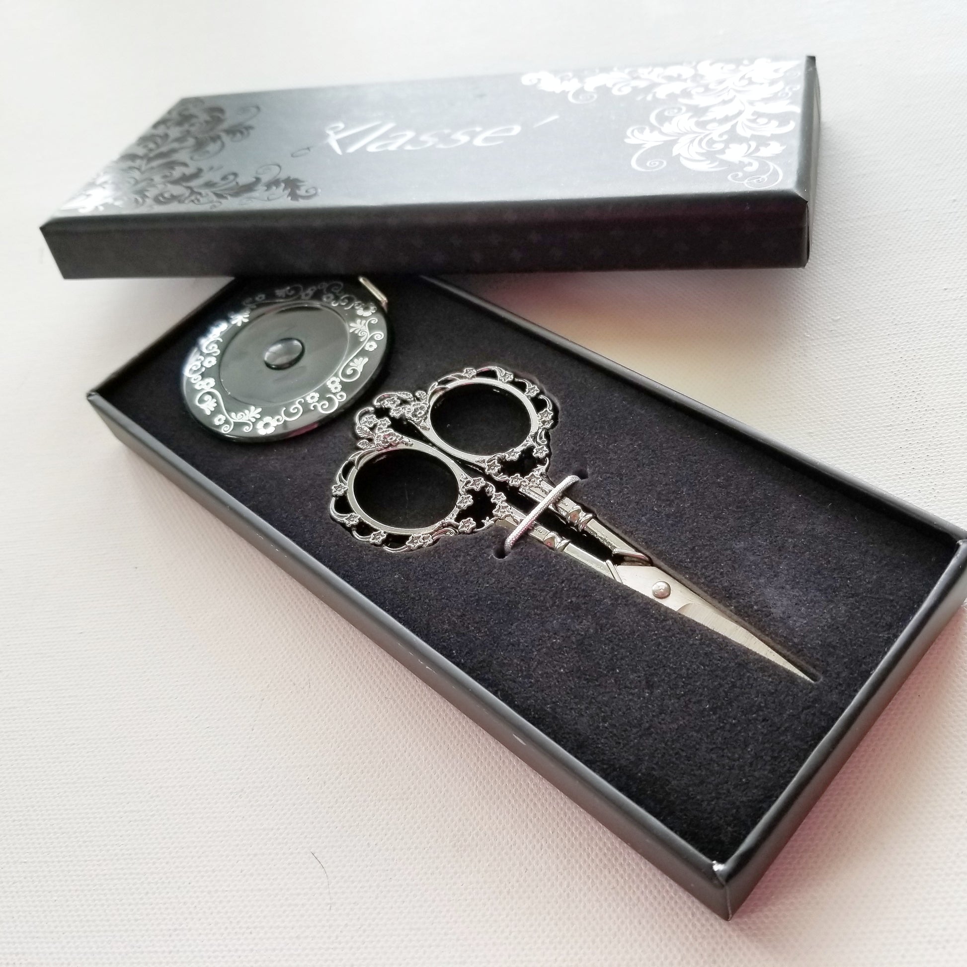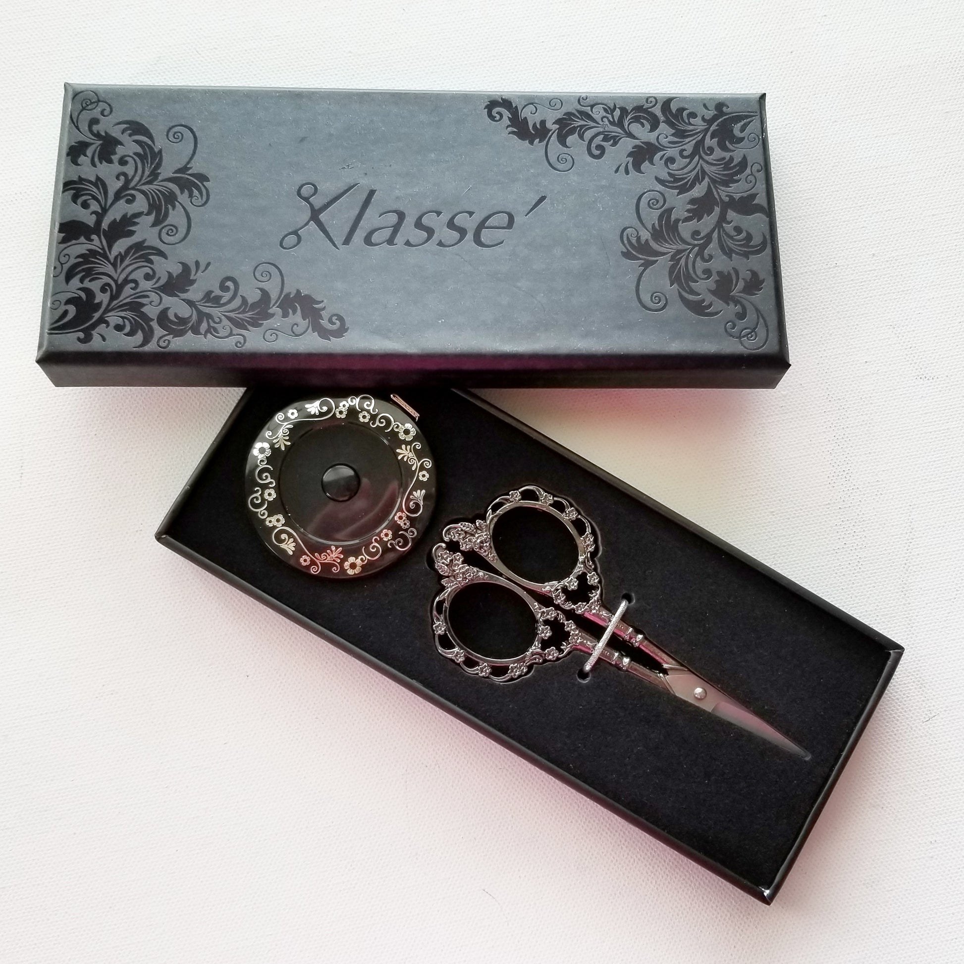 Spoil yourself or a special friend with this gorgeous antique silver scissor gift set! The set includes one pair of 4.5 inch embroidery scissors with a fine sharp point for precision and accuracy. In addition, the set comes with a black retractable tape measure (60 inches), decorated with silver foil. Distinctive antique design and finish presented in a premium Klasse' gift box.