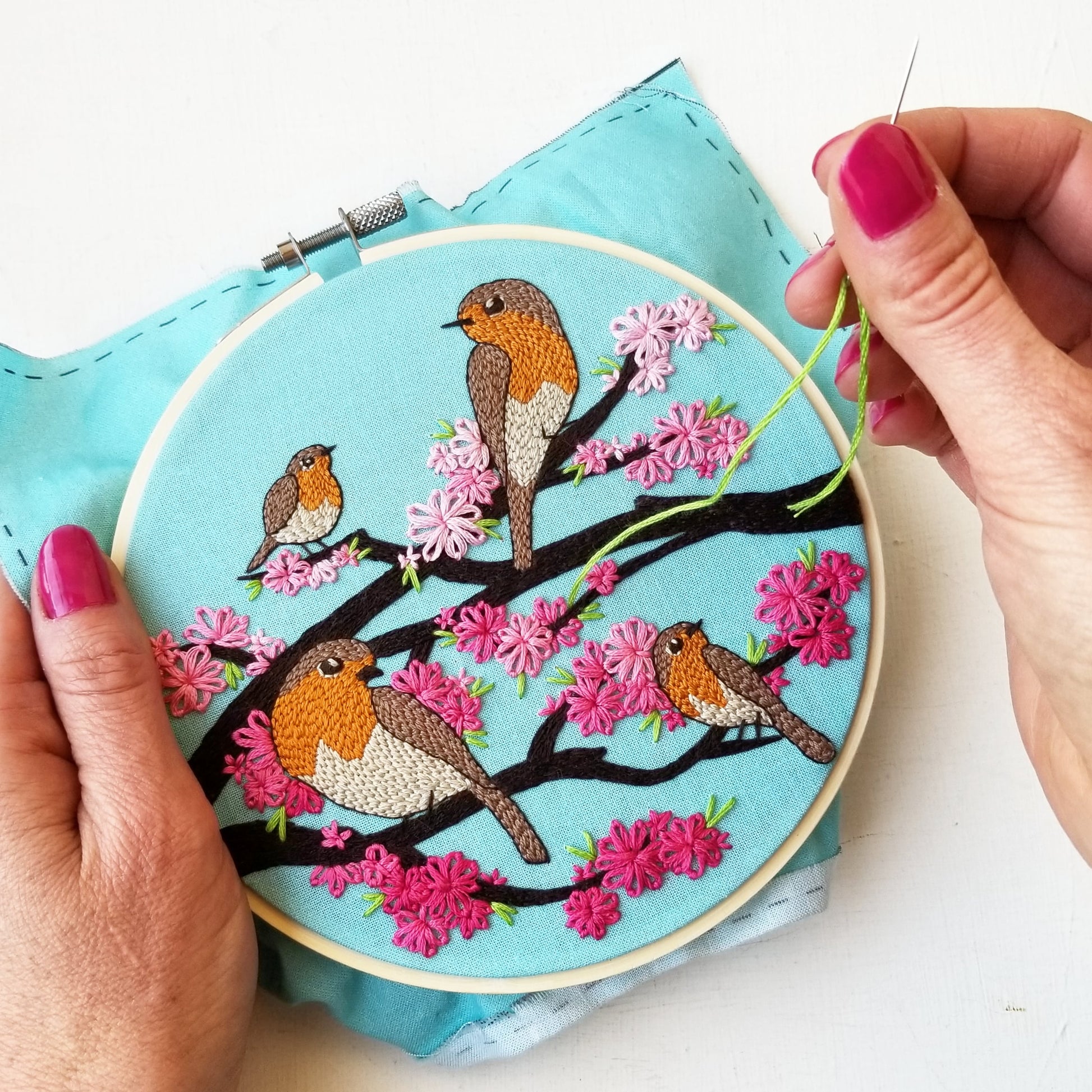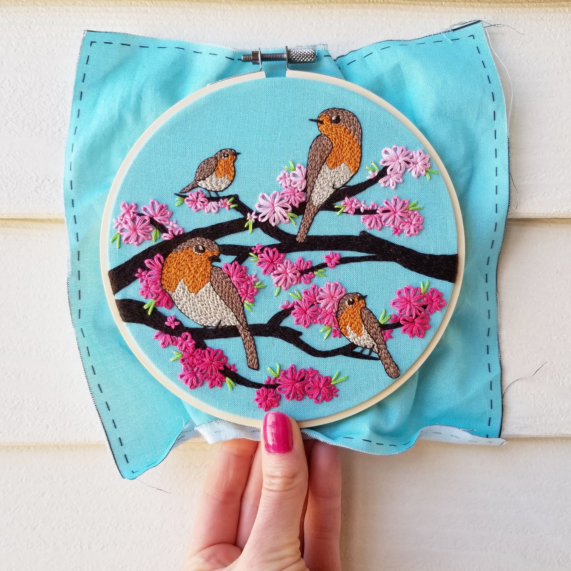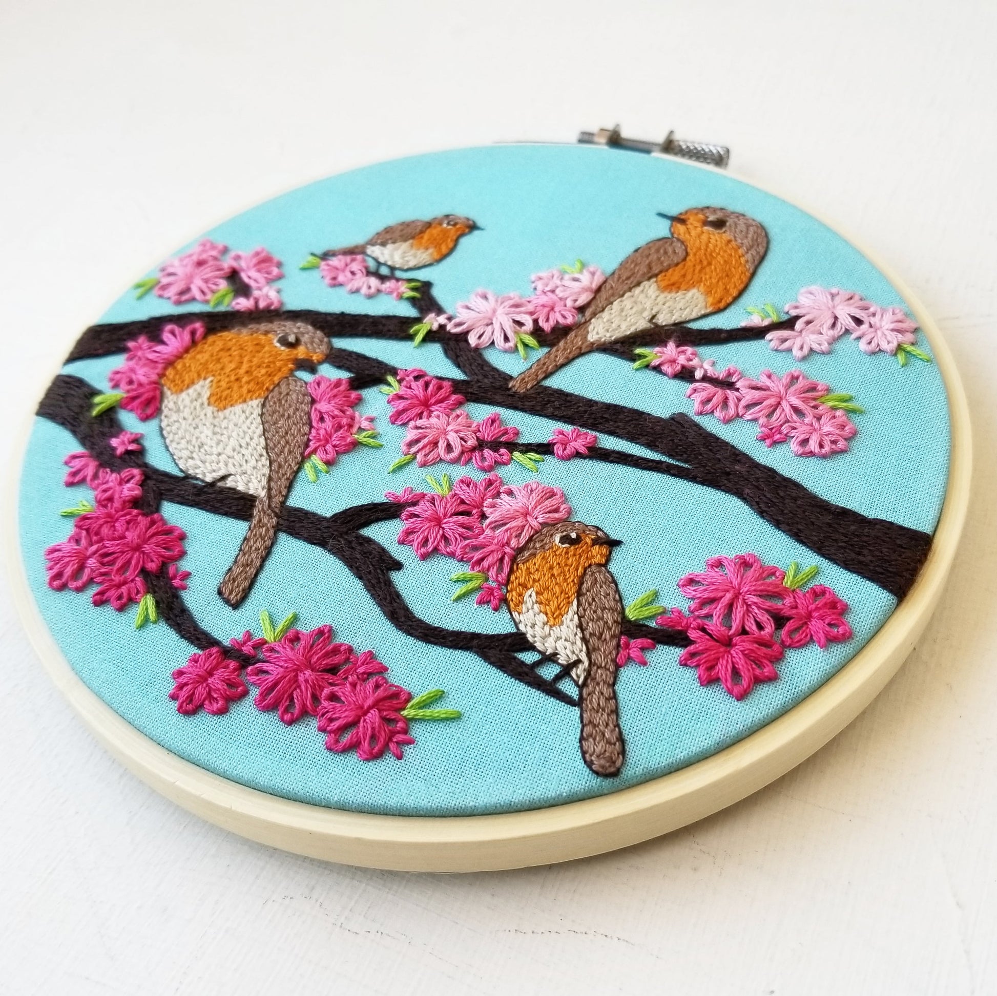 Practice back stitch, detached chain stitch and more as you create this bright scene of four perky birds perched on blossoming branches. This embroidery design is the second in a new series of seasonal bird projects. This pattern is absolutely beginner friendly and the included diagrams and online video tutorial will help you create unique embroidery art to decorate your walls with or to give as a gift.