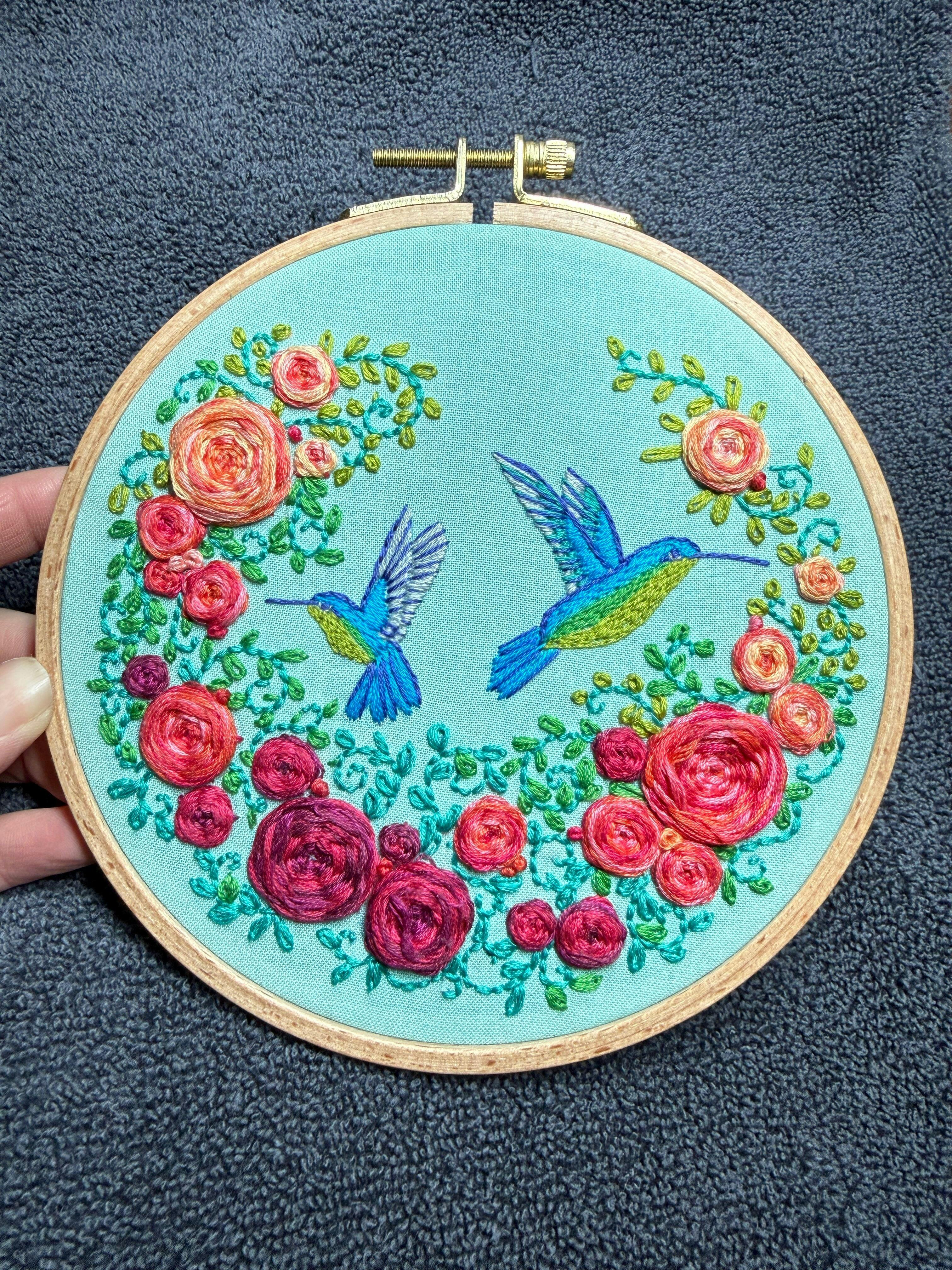 Practice woven wheel roses, back stitch, detached chain stitch and more as you create this summery scene of two busy hummingbirds surrounded by blooms. This kit is beginner friendly and the included diagrams and online video tutorial will help you create unique embroidery art to decorate your walls with or to give as a gift.