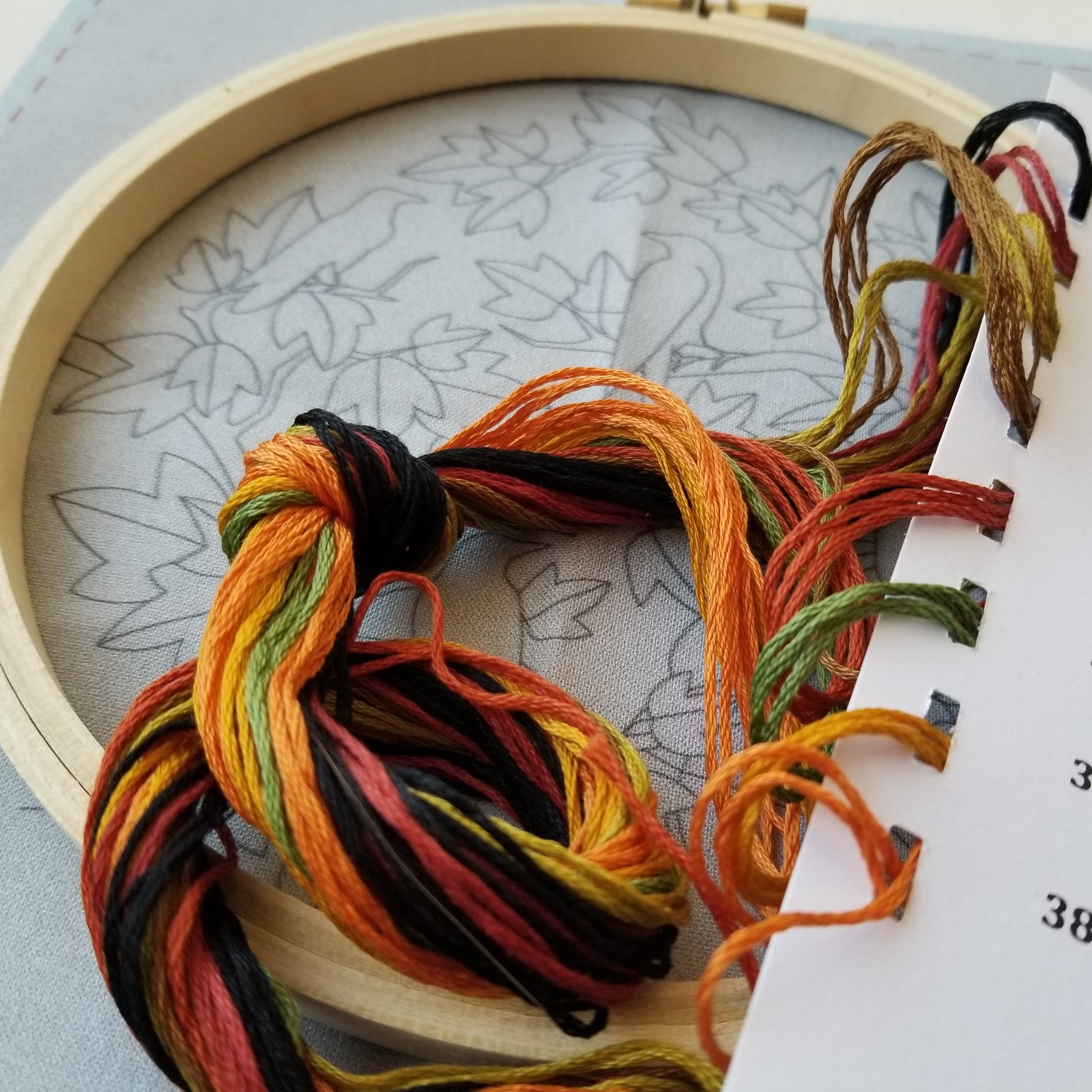 The final project in the seasonal birds series is here and it's my favorite! You'll only need to use two stitches (which you will be a pro at by the time you are done) to recreate this colorful autumn scene featuring black birds and colorful autumn leaves.