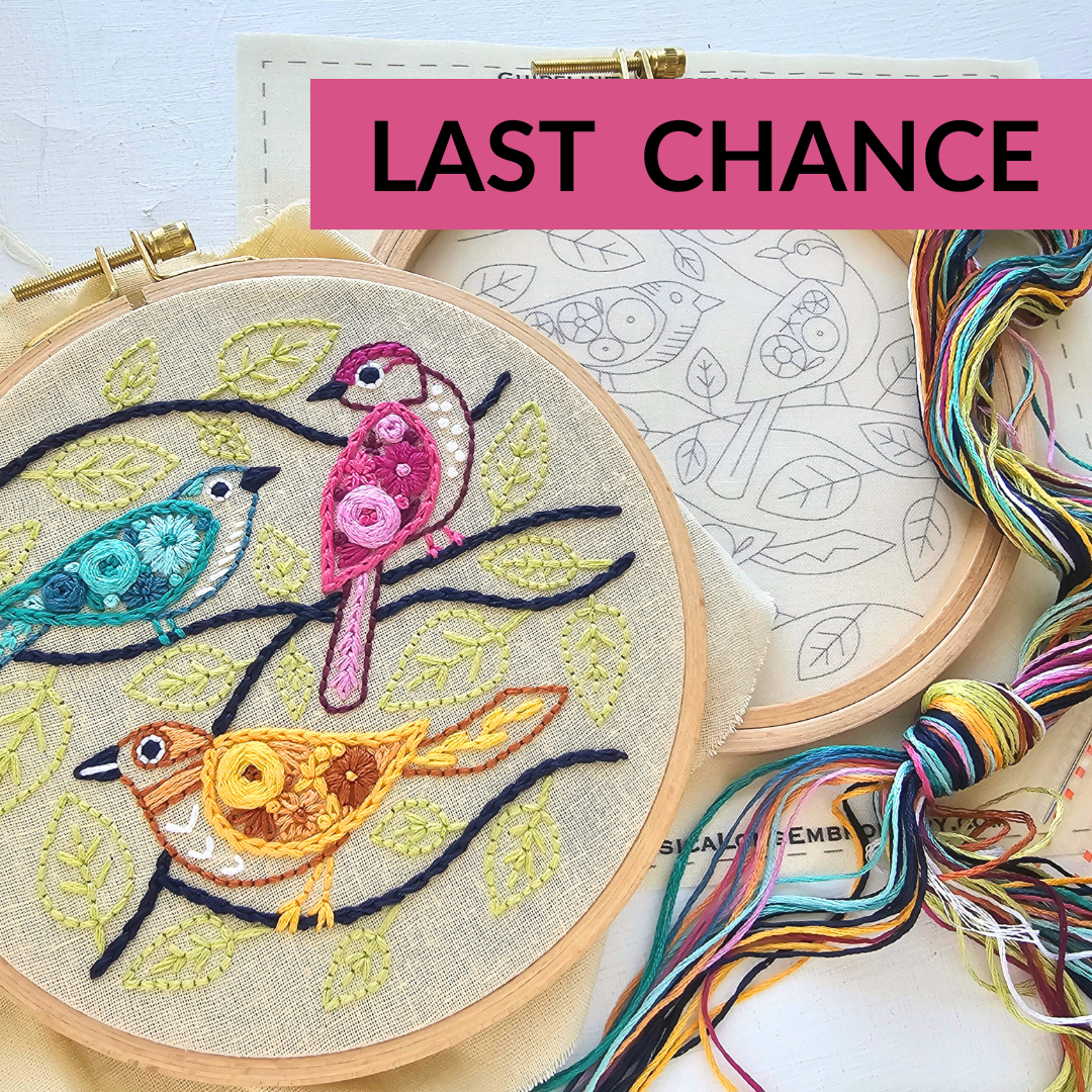 This colorful trio of birds is created using my favorite beginner hand embroidery stitches. The kit features quality embroidery supplies including cotton thread, printed fabric, a beechwood embroidery hoop and embroidery needles.