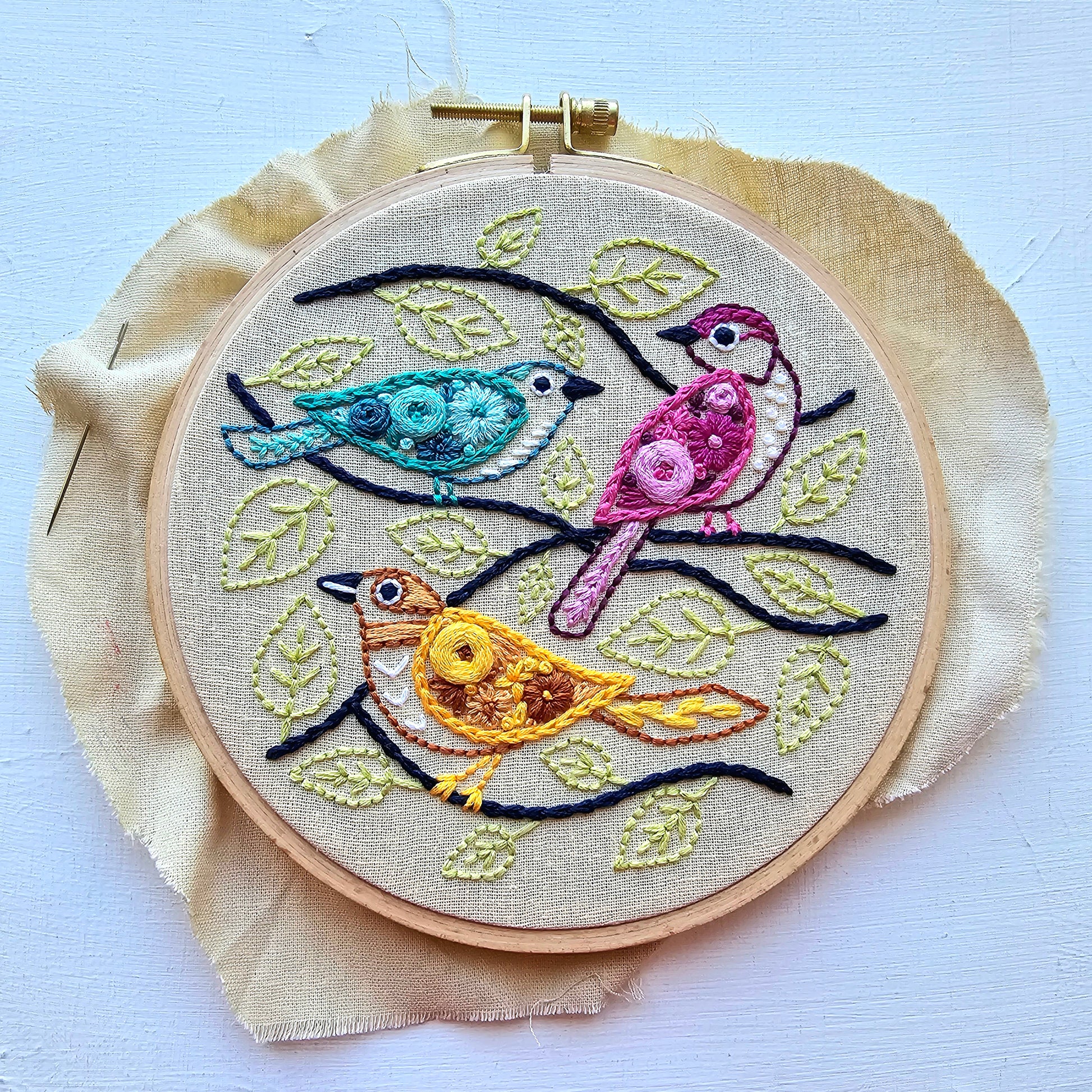 This colorful trio of birds is created using my favorite beginner hand embroidery stitches. Use the suggested DMC thread colors or customize the project to match your decor or favorite holiday.