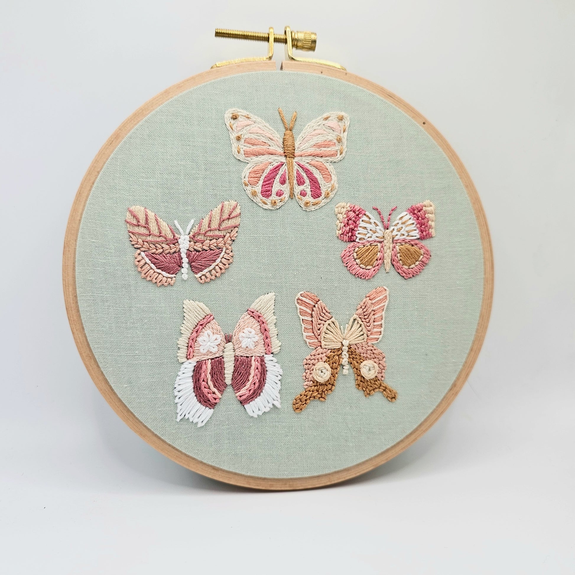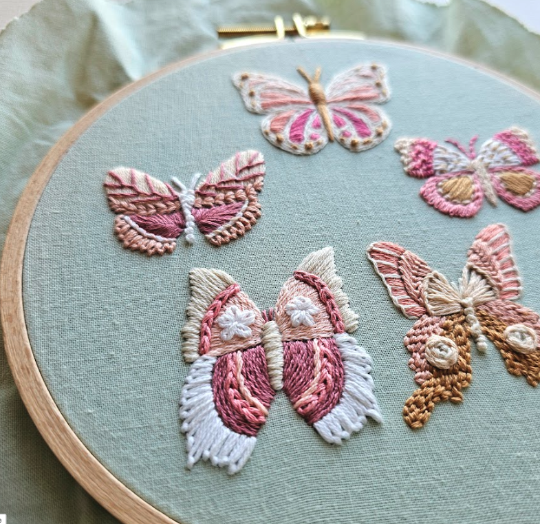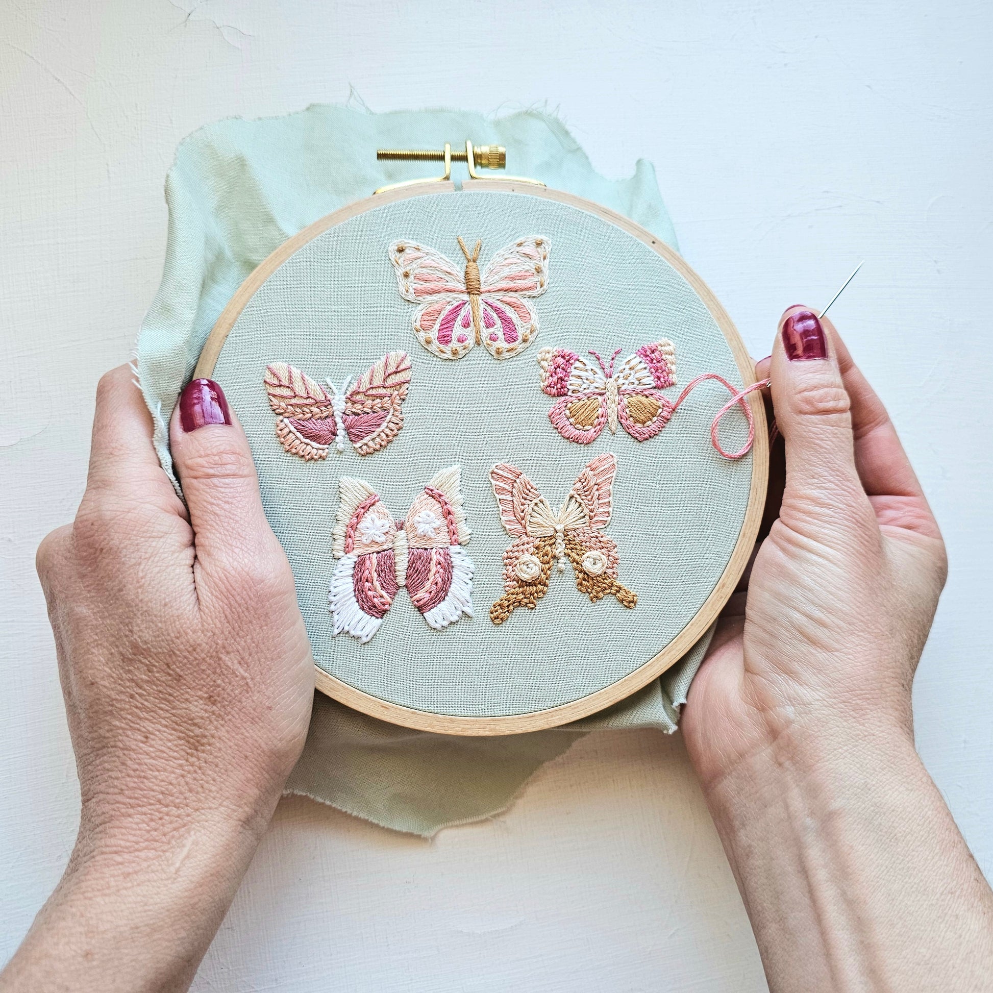 Have fun playing with classic hand embroidery stitches with this unique sampler. Each butterfly is created using interesting stitch combinations with a soft, romantic color palette. Beginner stitcher may find some of the stitch applications challenging but you can stitch along with the online video tutorial and make substitutions as needed to make the project more accessible.