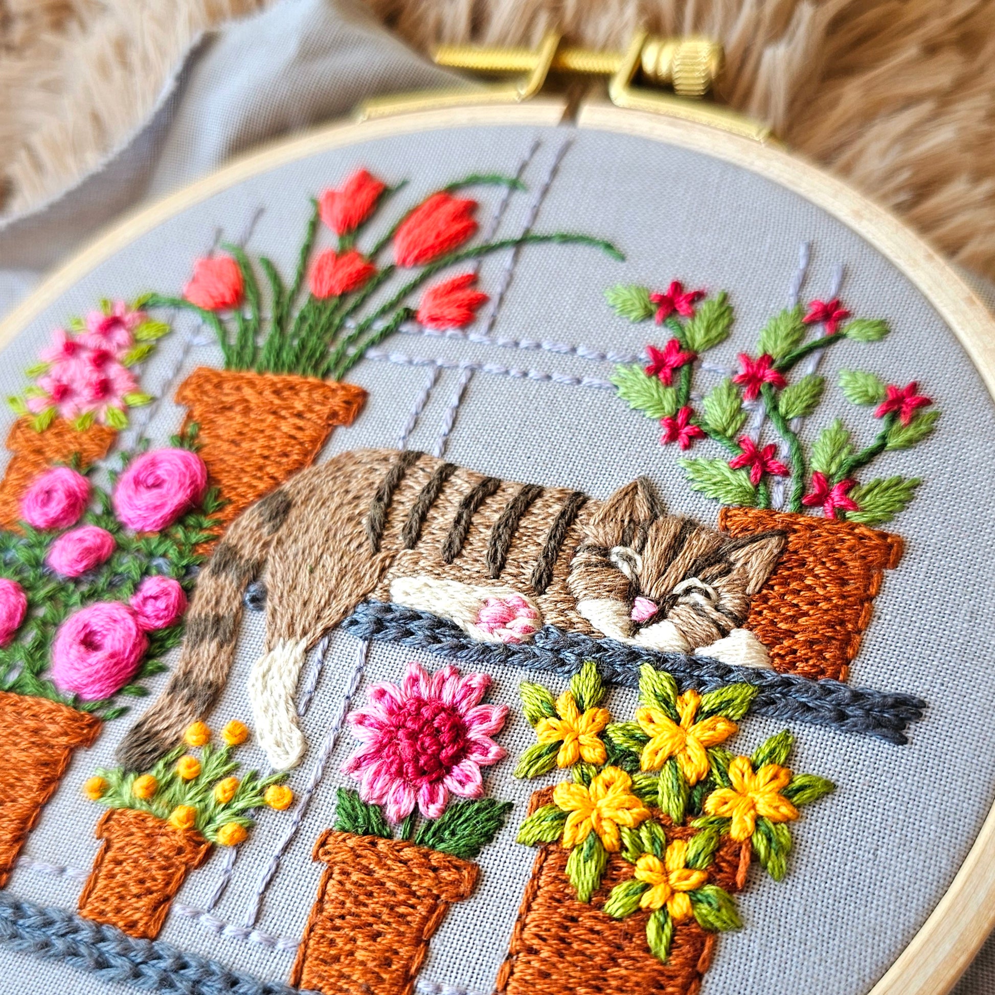 Enjoy stitching this sleepy tabby cat enjoying a lazy afternoon surrounded by colorful blooming plants! Over a dozen beginner embroidery stitches are used to create the florals, providing a wonderful opportunity to practice standard stitches in a variety of applications. The thorough embroidery instructions and online video tutorial will help guide you as you create this cozy embroidery art.