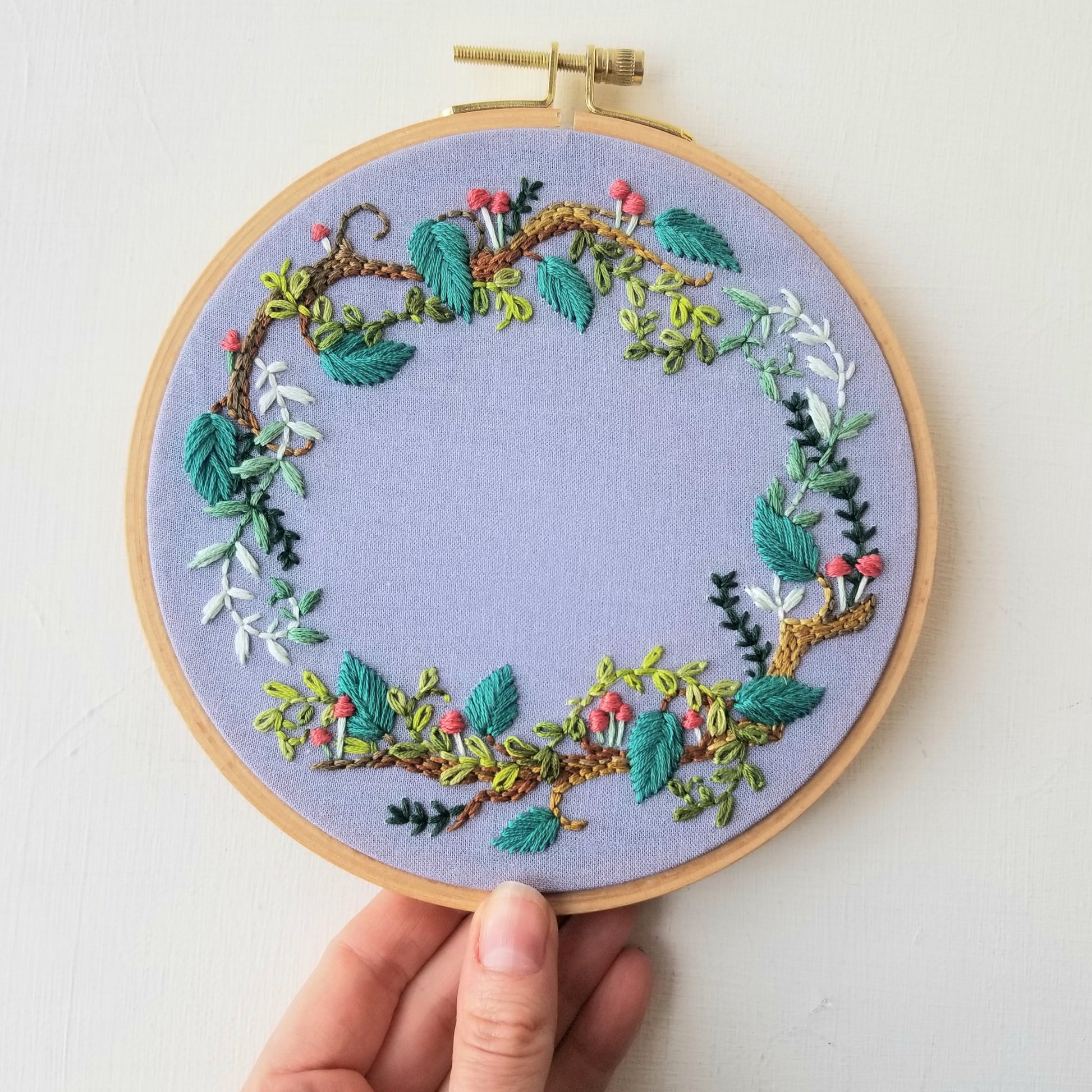 This beginner friendly pattern features a (possibly magical) wreath of branches, leaves and vines with sprouting mini mushrooms. The elements overlap and curve around in each other in a playful way and the wreath invites the opportunity to add a custom quote or image in the center of the hoop. The variegated floss colors add an additional layer of fun, with your unique color-way unfolding as you stitch.