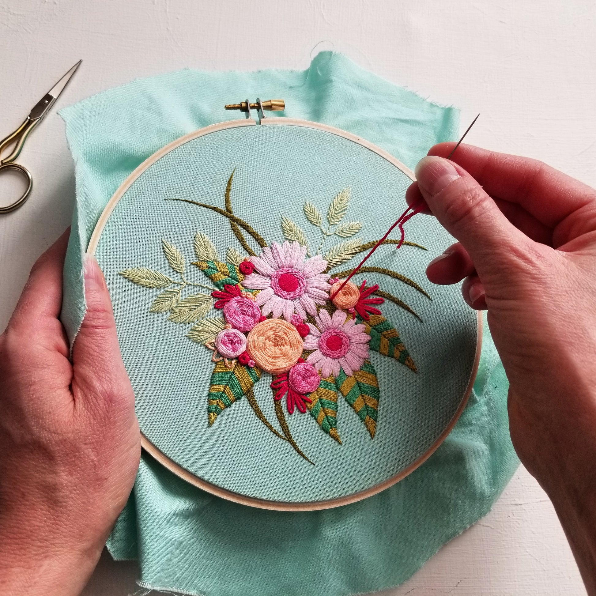 This bright, fresh floral spray features eight hand embroidery stitches and is suitable for beginners. A bonus "mini blooms" pattern is included in your instructions for you to use.
