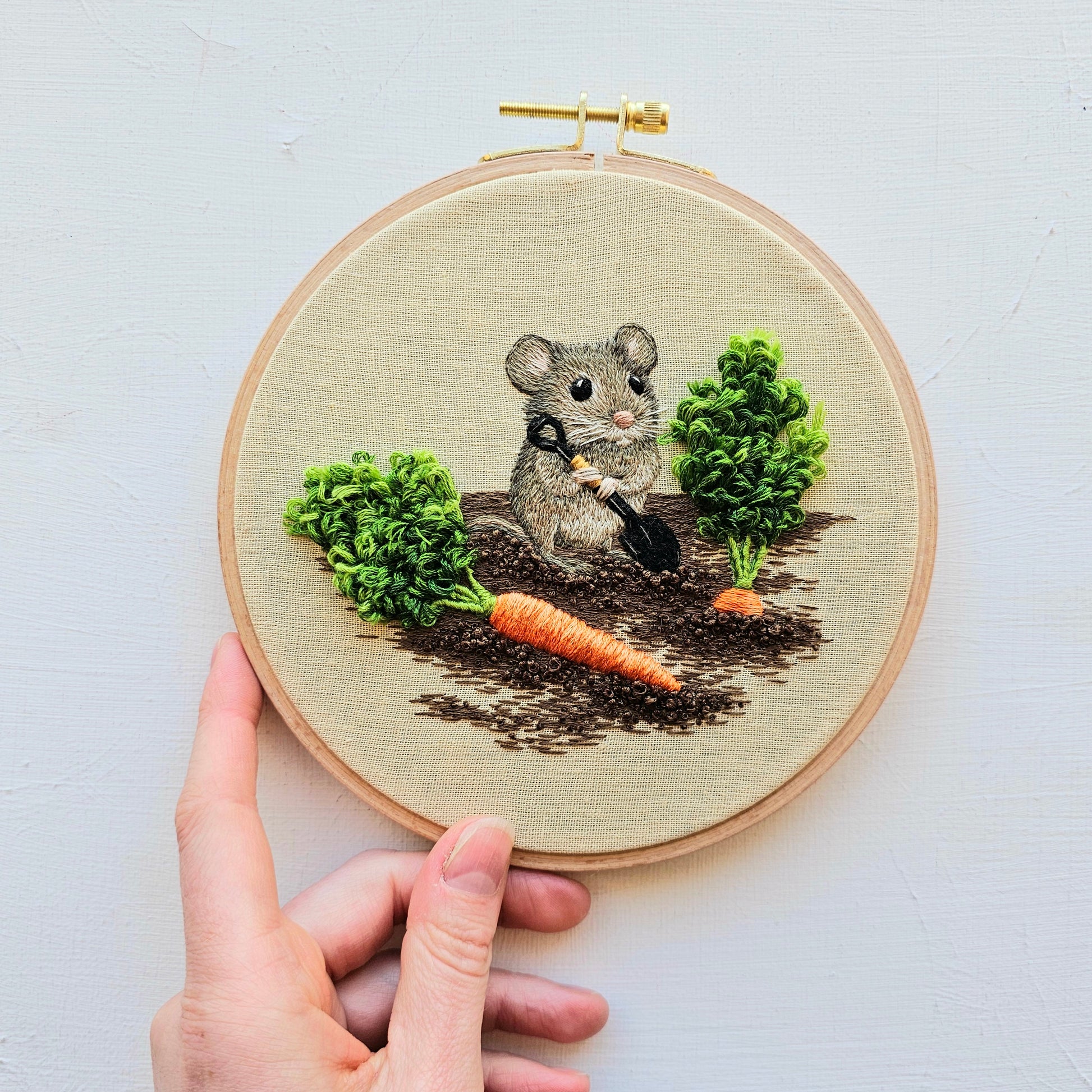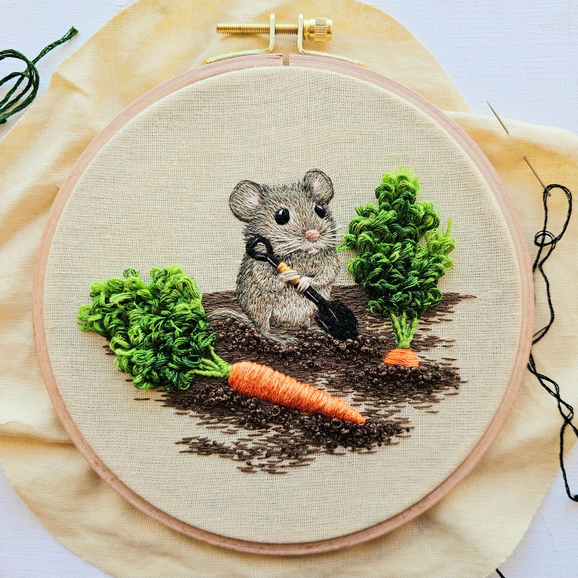 This challenging embroidery project combines thread painting and stump work to create this sweet mouse working in her vegetable garden. The printed instructions and online video tutorial will be your guide as you pad the carrots, create the 3D leaves and fill the mouse with realistic fur.