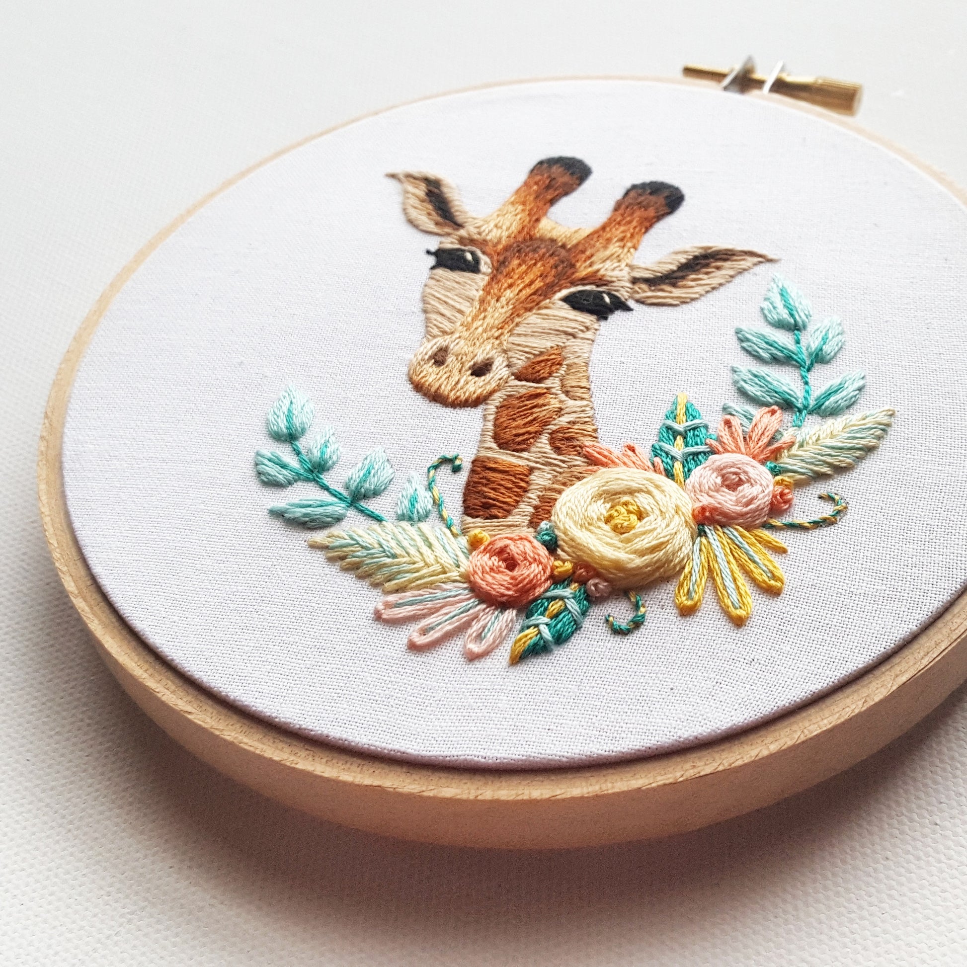 Your purchase includes the Giraffe embroidery pattern and a copy of my beginner guide. The embroidery pattern includes stitch and color keys for the giraffe and florals, a complete shopping list with suggested DMC embroidery floss colors, color close up photo of stitched pattern and the Giraffe design sized for a 5 inch hoop.