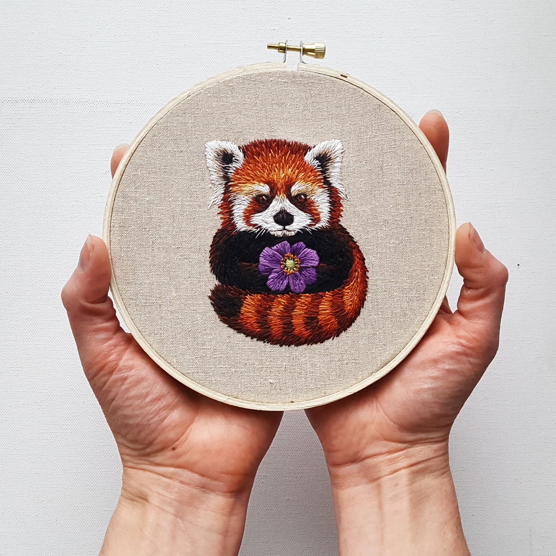 Your purchase includes the Red Panda embroidery pattern and a copy of my beginner guide. The embroidery pattern includes, suggested DMC embroidery floss colors, stitch, color and direction keys, written directions for stitch order and blending patterns, color close up photo of the stitched pattern and the design sized for a 5 inch hoop ready to print.