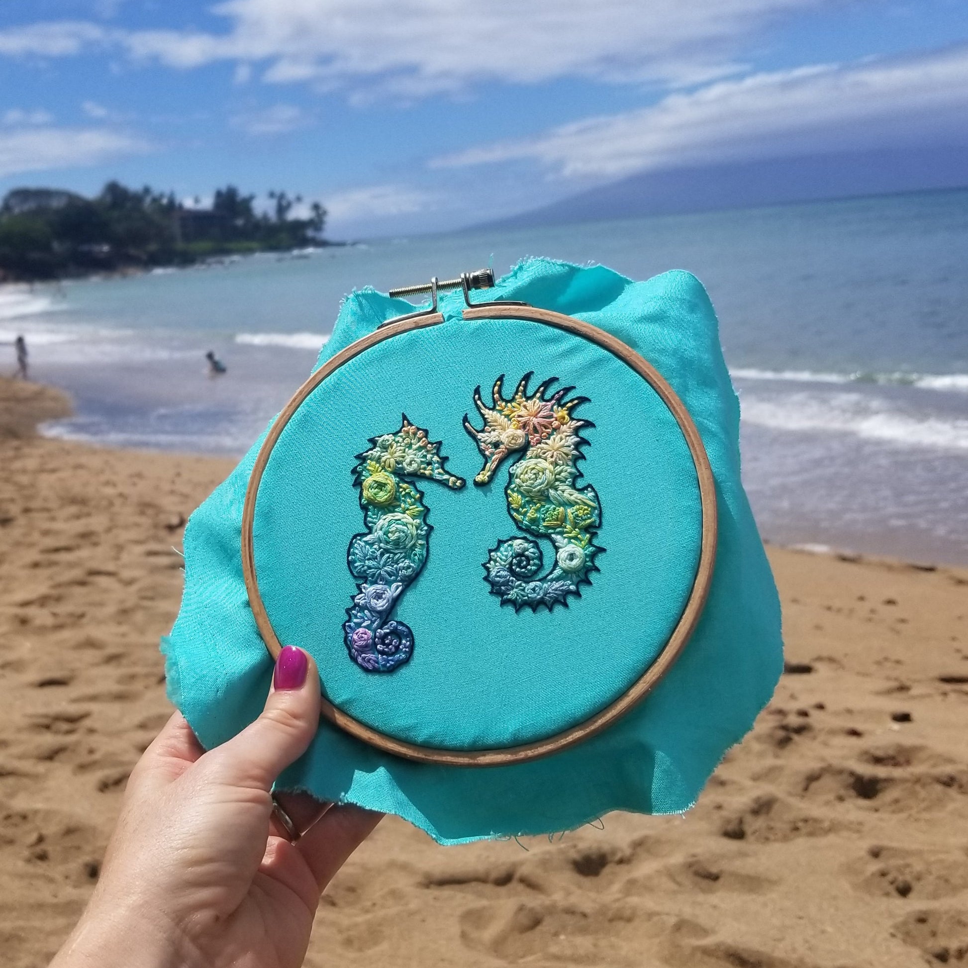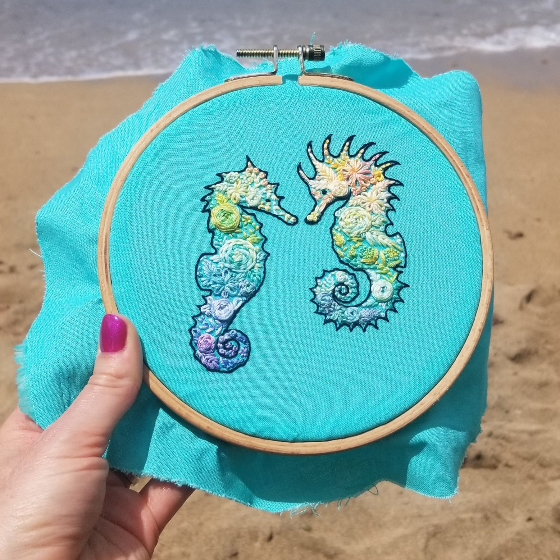 This beginner friendly pattern features two colorful seahorses filled with my favorite hand embroidery stitches! Using eight colors of variegated threads you'll create this rainbow ombre effect as you practice chain stitch roses, fishbone leaves, attached fly stitch and more.