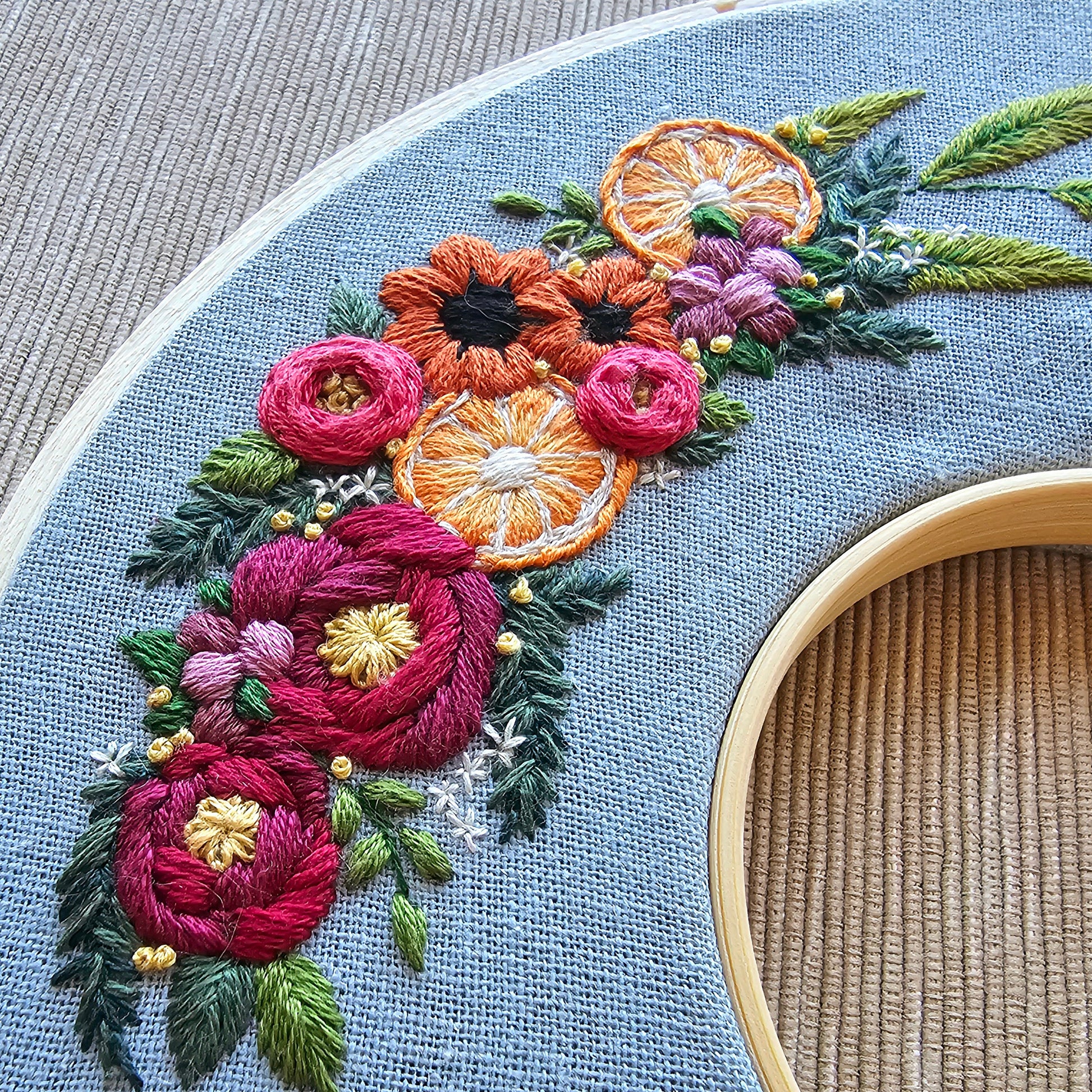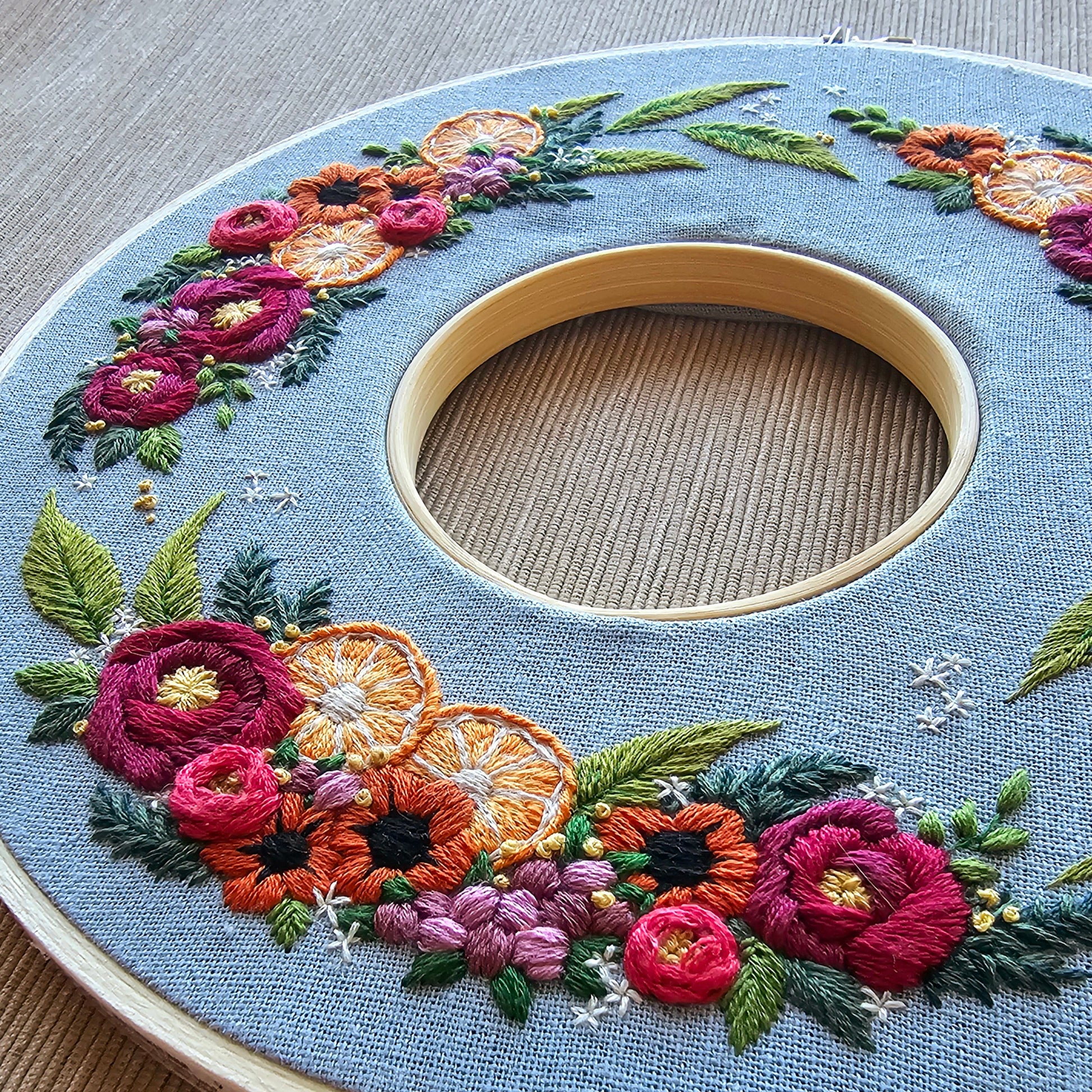 This cheerful wreath features rich red florals, bright orange slices and ripe berries surrounded by a variety of lush green leaves. Using a fun mixture of hand embroidery stitches and thread thicknesses you can recreate the dynamic textures featured in this unique craft project.