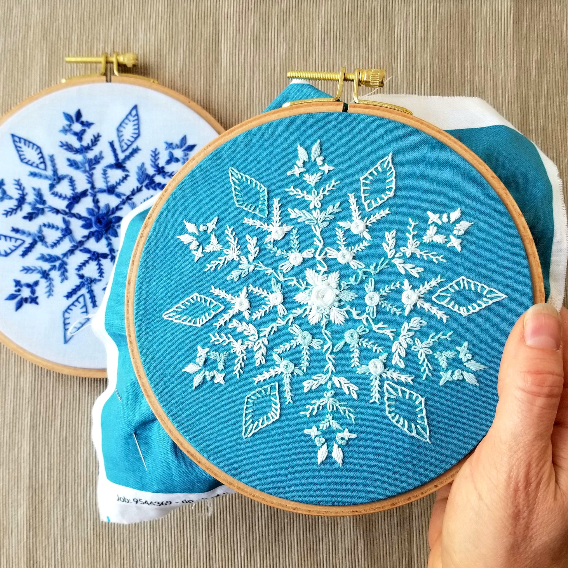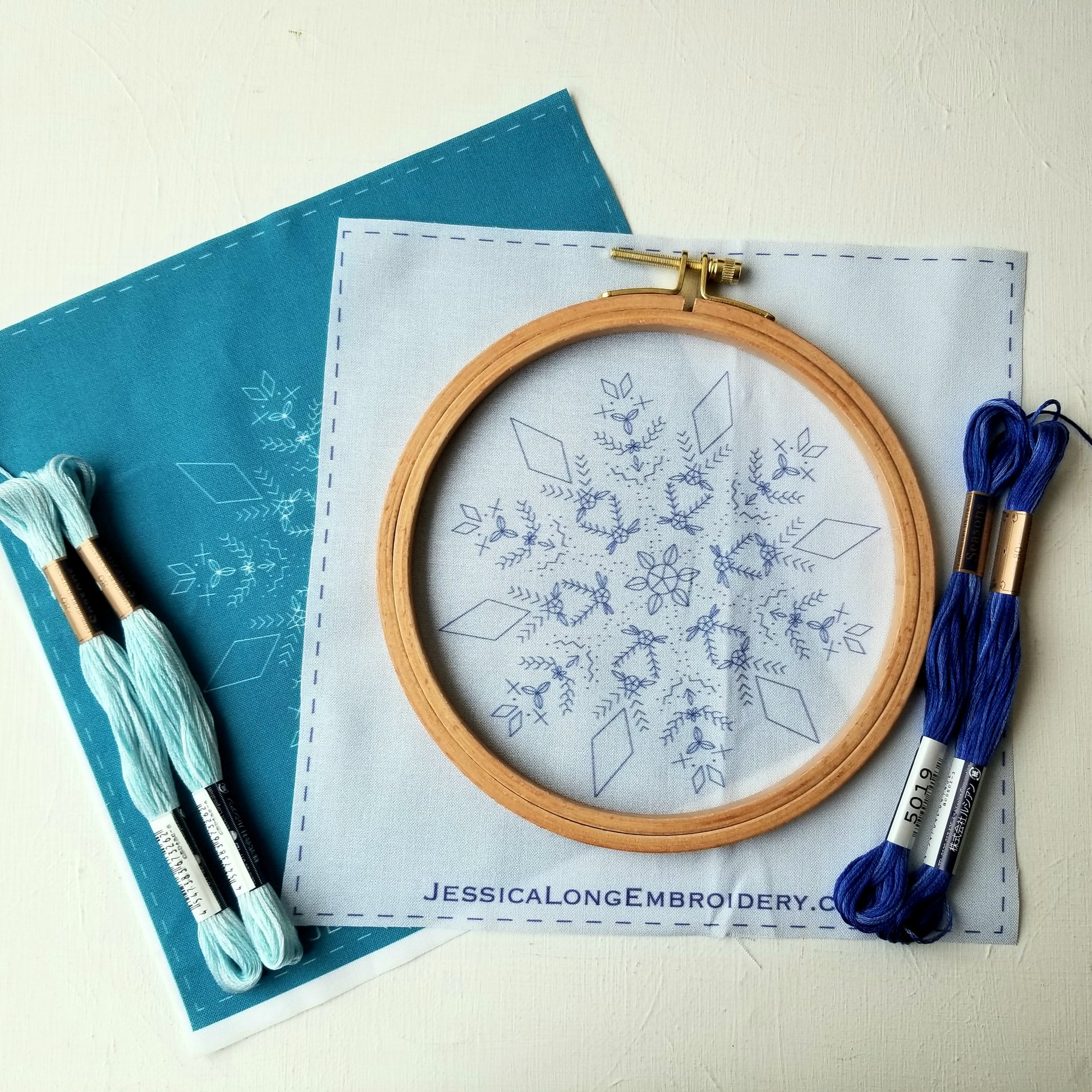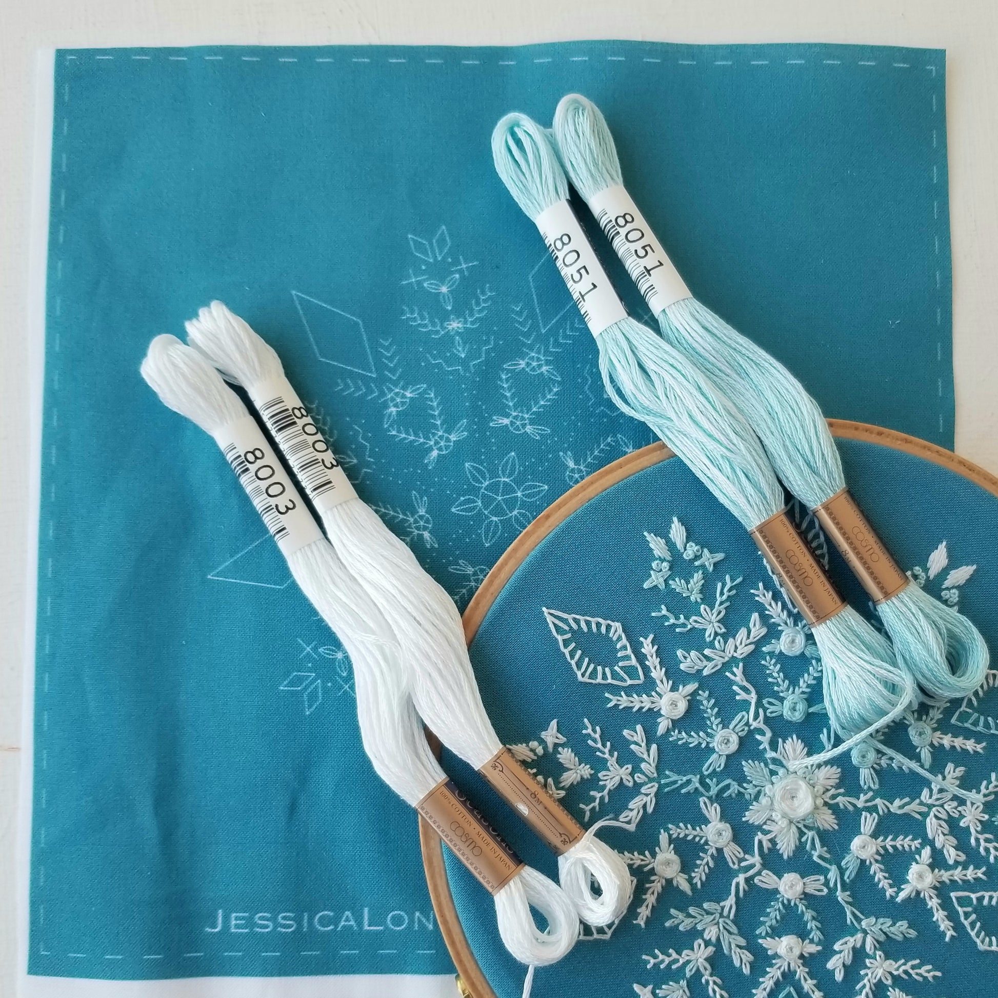- Two skeins of embroidery floss: variegated blue or variegated light blue/white, depending on fabric color. I used 8051 for the sample hoop but am also offering a lighter version (nearly white) with color 8003.